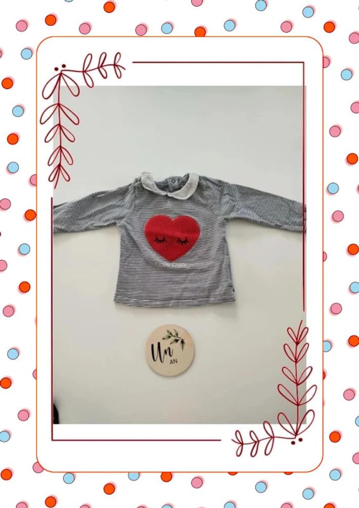 👕 top a rayures col claudine ✂️ Taille 12 mois 🧸 Obabi 🎨 Noir et blanc , motif coeur rouge ✅ Très bon état #rosecitron222_12mois