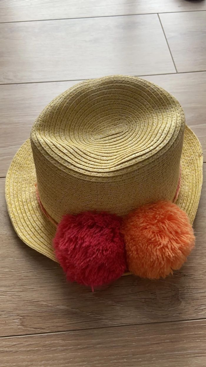 Chapeau fille avec pompons Taille : 51/52 cm Très bon état (un peu de stylo à l’intérieur non visible à l’extérieur)
