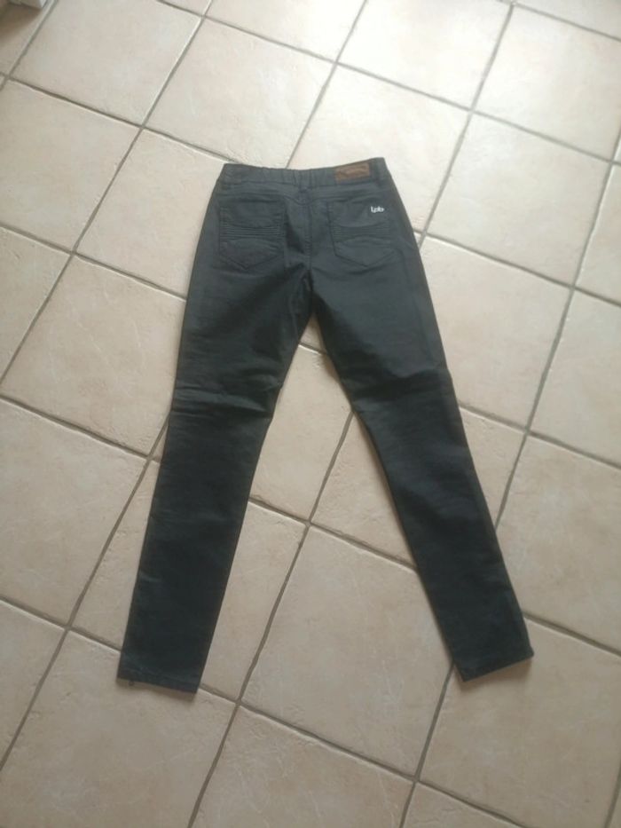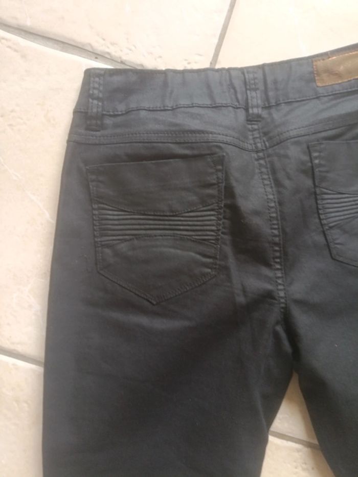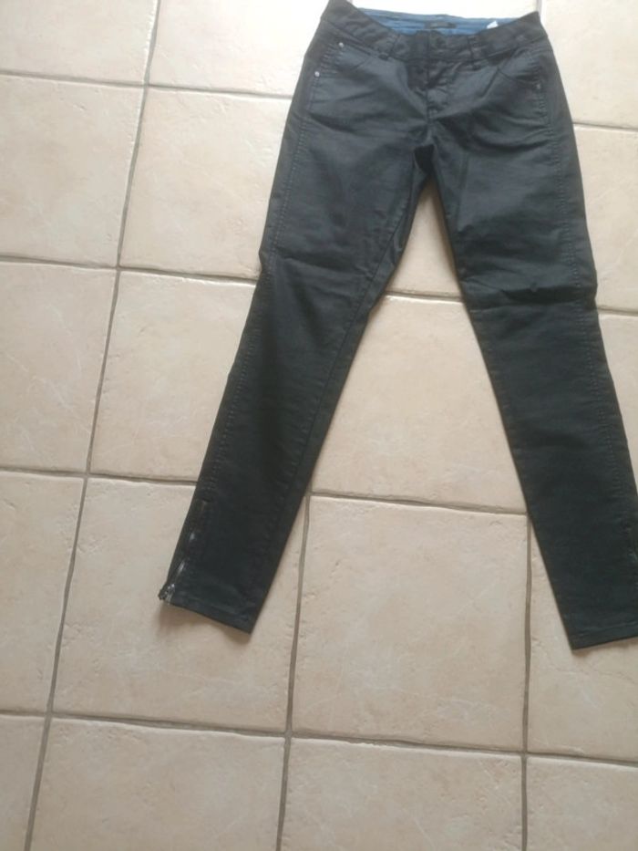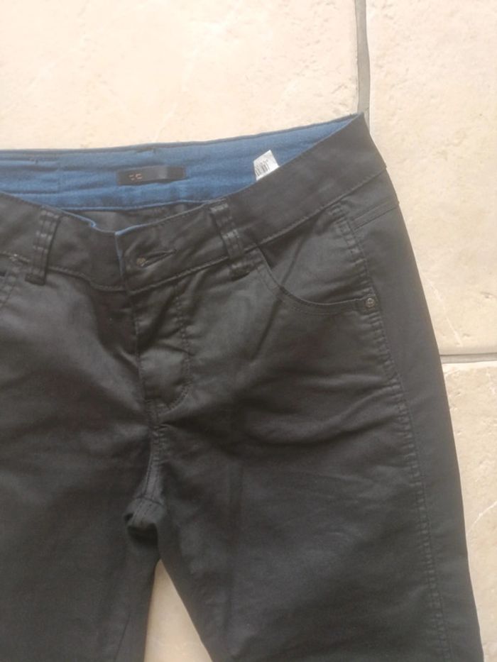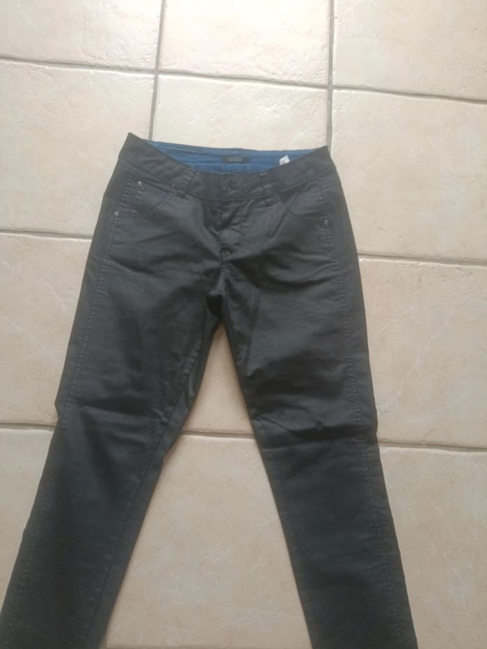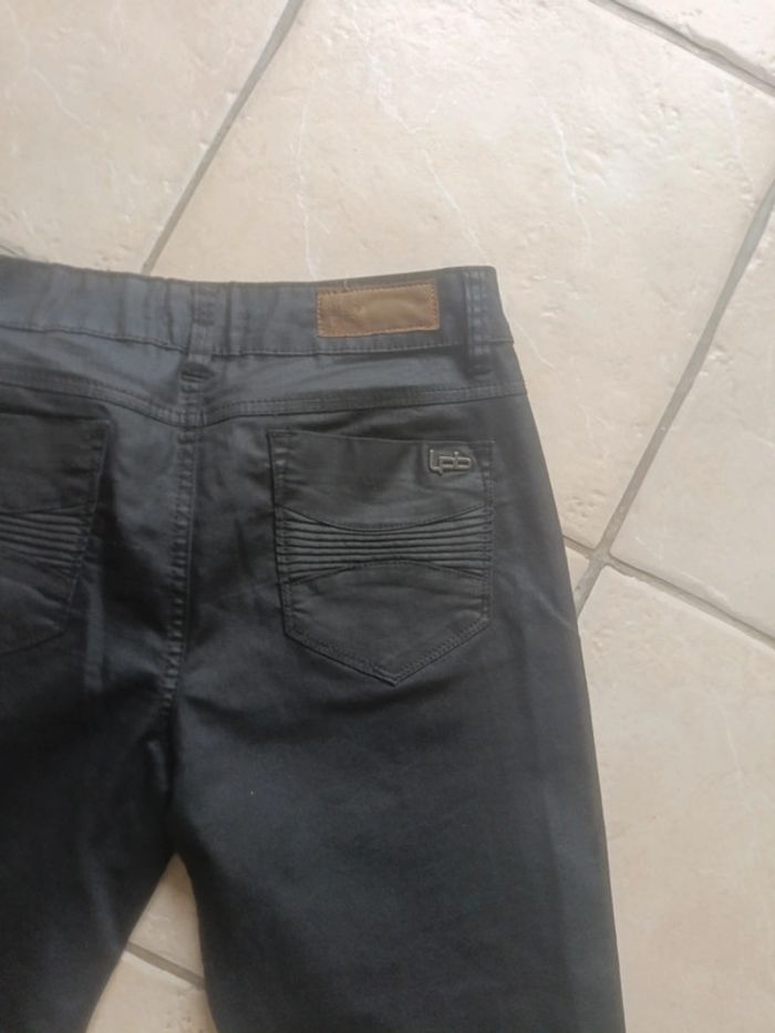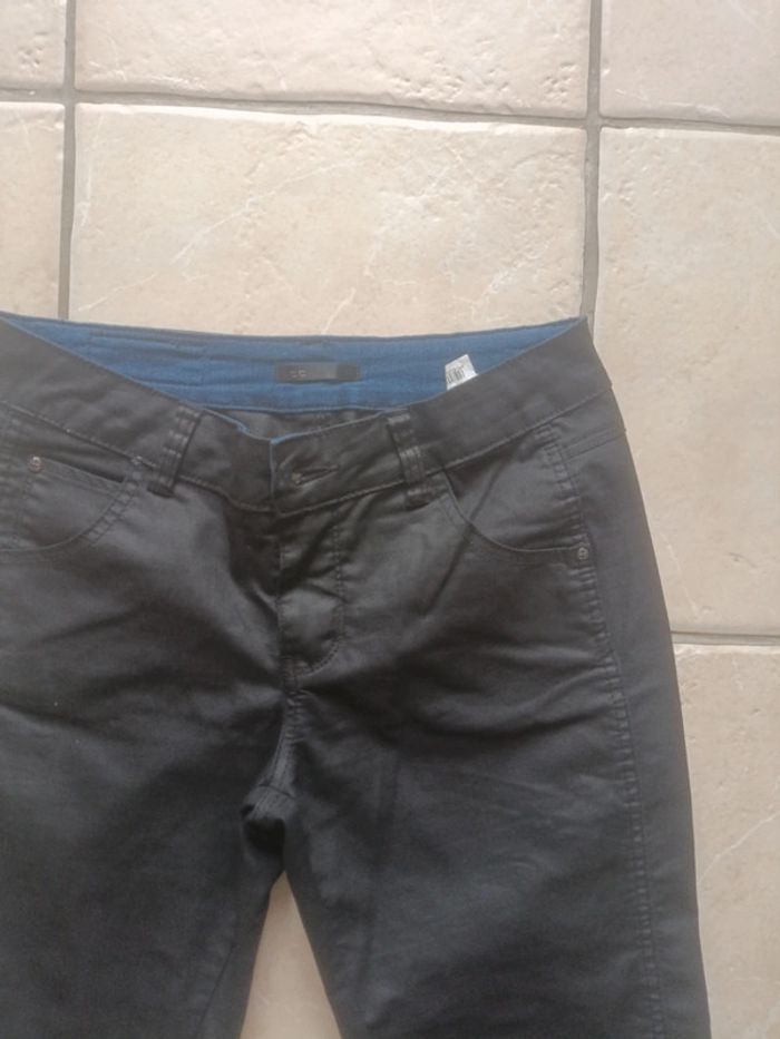 Jean les petites bombes noir effet satiné. Fermeture éclair au niveau de la cheville..en très bon état. Taille 38