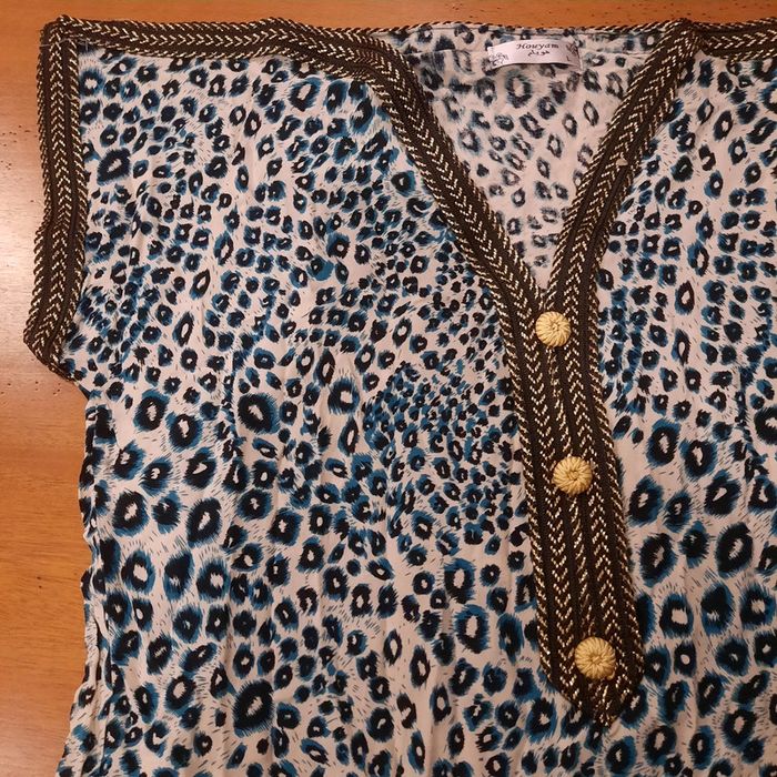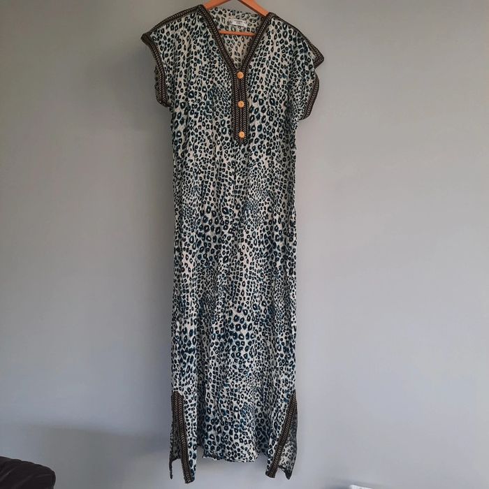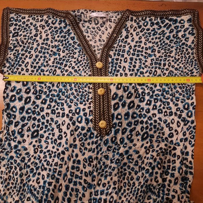 Taille L marquée mais vérifiez vos mesures (ça me semble plus petit) Voici celles de la robe : Hauteur totale 135cm Largeur entre aisselles indiquée en photo J'ai activé le prix réduit en cas d'achats de plusieurs articles