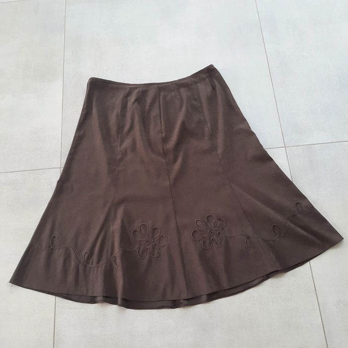 Cette superbe jupe n'a plus son étiquette (elle sortait tout le temps) et je ne me rappelle plus a 100% de la marque (mais je crois que c'est Toscane) Je faisais du 52... elle est devenue trop grande suite à un amaigrissement. Elle m'arrive mi-mollets ... pile la bonne longueur! En espèce de suédine, elle ferme avec une fermeture éclair au dos qui fonctionne parfaitement (photo 1) Jolie portée, elle me manquera