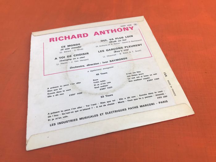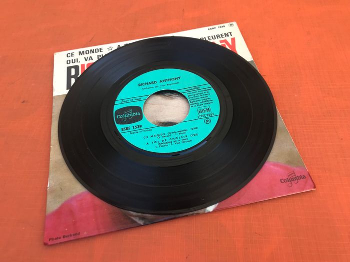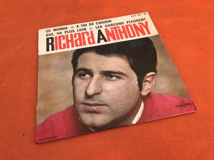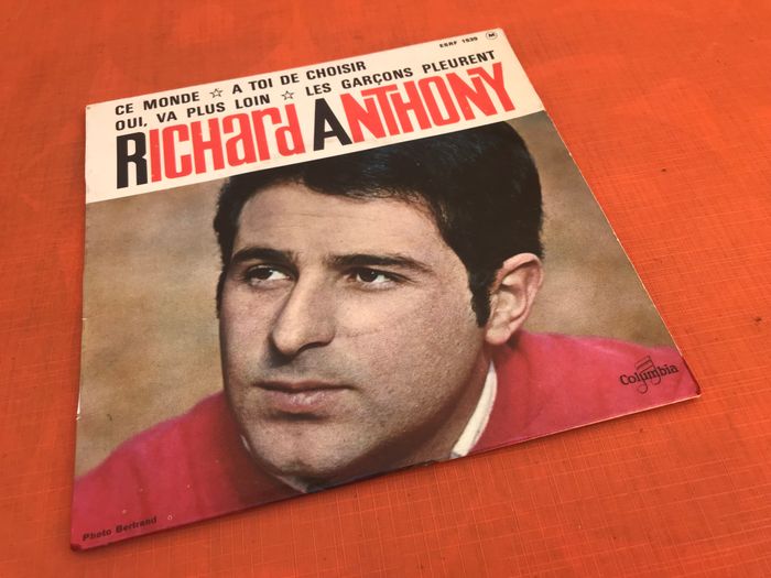 (article vendu en l' état, micro-rayures qui n' empêchent pas l' écoute du vinyle état d' usage voir toutes les photos) Vinyle 45 tours Richard Anthony Ce monde (1964) Columbia ESRF 1539 A1 Ce monde Written-By – G. Bérard*, L. Bindi* 2:40 A2 A Toi de choisir Accompanied By – Dominique Moutet Written-By – J. Plante*, J. Van Heusen* 2:25 B1 Oui, va plus loin Written-By – A. Salvet*, David Et Bacharach*, R. Anthony* 2:30 B2 Les garçons pleurent Written-By – B. Kaye*, J. Chaumeil*, T. Scott* 2:25