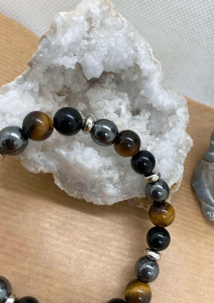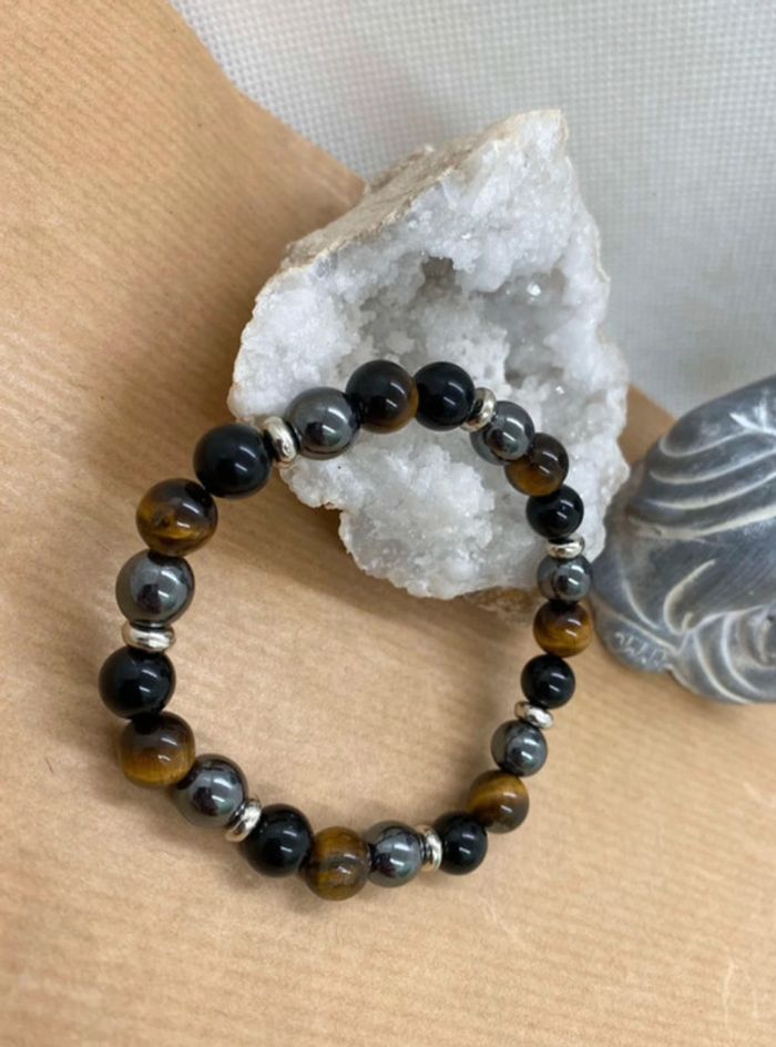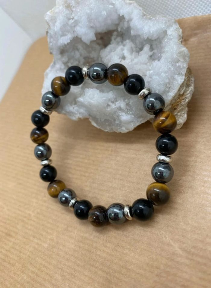 Très joli bracelet triple protection en pierres naturelles Taille 18,5 cm , perles de 8 mm ⚡️L’obsidienne noire ⚡️ - l’obsidienne noire est une puissante pierre de protection, - l'obsidienne noire est une pierre de répulsion, elle repousse toutes les énergies négatives surtout ceux qui cherchent à profiter de la personne - l'obsidienne noire nous fait ressortir notre moi profond, les bons comme les mauvais traits. cest pourquoi il est conseillé de ne pas porter l'obsidienne noire tout le temps. Il s'agit d'une pierre d'introspection. 🪨L’hématite 🪨 Pierre idéale pour le manque de confiance en soi. idéale pour retrouver l’équilibre. Elle peut vous donner du courage, de la volonté de la force et la joie de vivre, très utilisée contre la dépression réduit le stress et évacue les mauvaises pensées. L’Hématite peut également vous aider à optimiser votre capacité d’écoute et votre patience. favorise la confiance en soi et renforce la conviction. Elle aide donc à combattre la timidité et c’est un bon allié pour les personnes introverties. Il ne faut pas oublier ses effets positifs sur les individus colériques. Elle peut vous aider à utiliser vos énergies dans des actions plus positives. L’Hématite possède aussi le pouvoir d’éliminer les liens toxiques qui pourraient vous empêcher d’avancer dans la vie. Il faut citer, entre autres, les emprises psychiques et toutes sortes de relations toxiques. La pierre vous protègera des mauvaises ondes. Ainsi, même face aux divers obstacles, vous serez capable de trouver votre chemin et vous pourrez aussi les surmonter facilement. Œil de tigre Grâce aux vertus de la pierre qui le compose, le bracelet œil de tigre constitue un véritable barrage contre les énergies négatives et les malédictions. Il agit même comme un miroir et renvoie ces ondes négatives vers l'objet ou la personne qui les a émises. 56 #laetis0507hematite #laetis0507obsidienne #laetis0507oeildetigre #laetis0507tripleprotection
