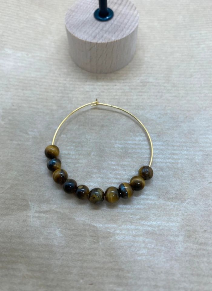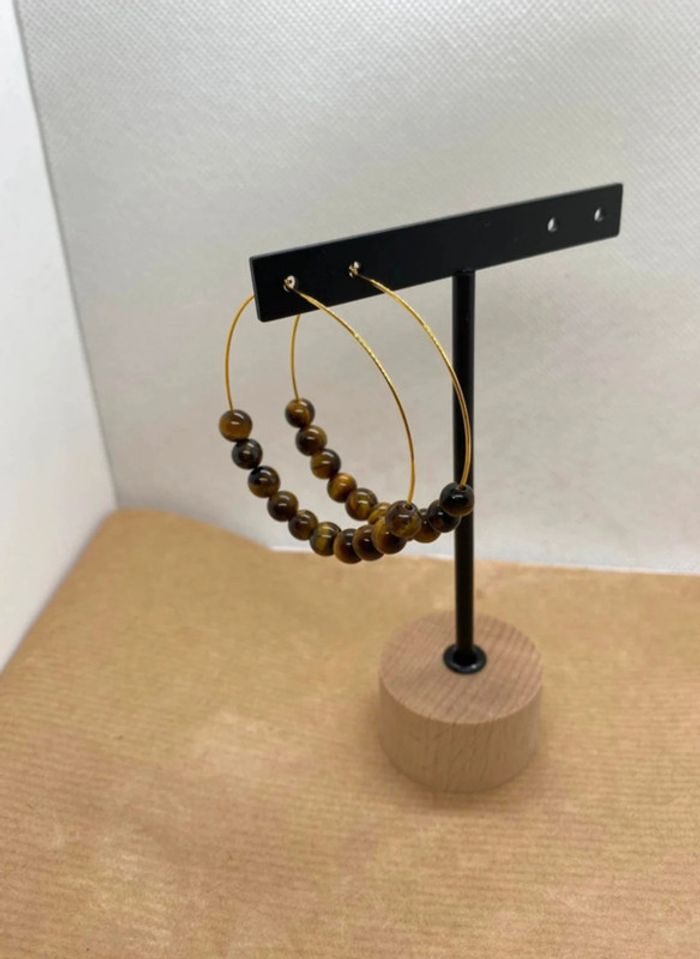Très jolies boucles d’oreilles créoles en acier inoxydable munies de perles d’œil de tigre en 6 mm Diamètre 4,5 cm Œil de tigre Grâce aux vertus de la pierre qui le compose, le bracelet œil de tigre constitue un véritable barrage contre les énergies négatives et les malédictions. Il agit même comme un miroir et renvoie ces ondes négatives vers l'objet ou la personne qui les a émises. #laetis0507oeildetigre #laetis0507bouclesdoreilles
