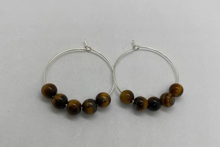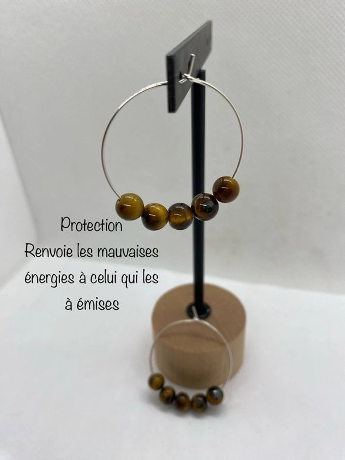 Très jolies boucles d’oreilles rondes en acier inoxydable avec perles naturelles d’œil de tigre en 6 mm Diamètre 3 cm , jamais utilisées Œil de tigre Grâce aux vertus de la pierre qui le compose, le bracelet œil de tigre constitue un véritable barrage contre les énergies négatives et les malédictions. Il agit même comme un miroir et renvoie ces ondes négatives vers l'objet ou la personne qui les a émises. #laetis0507bouclesdoreilles #laetis0507oeildetigre