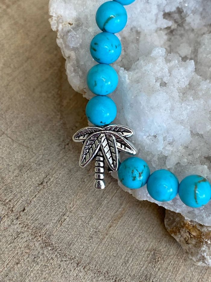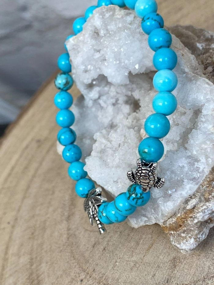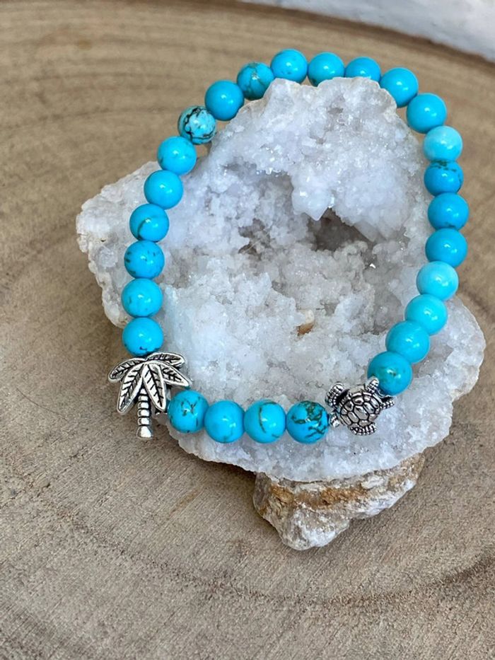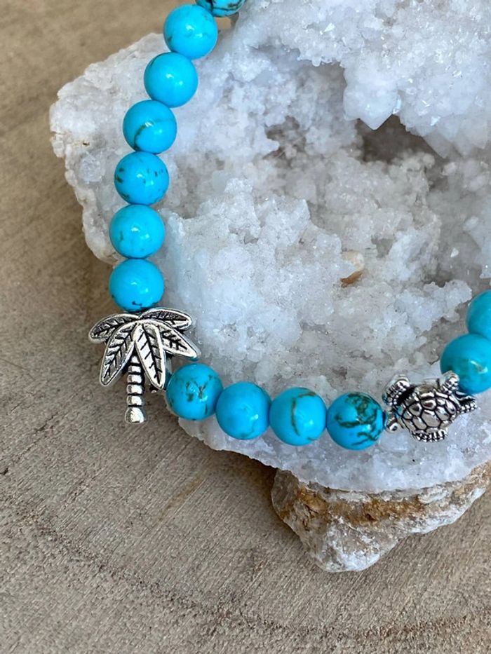Bracelet howlite bleu teintée , tortue et palmier , 18 cm lithothérapie - photo numéro 1