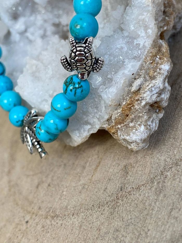 Bracelet howlite bleu teintée , tortue et palmier , 18 cm lithothérapie - photo numéro 4