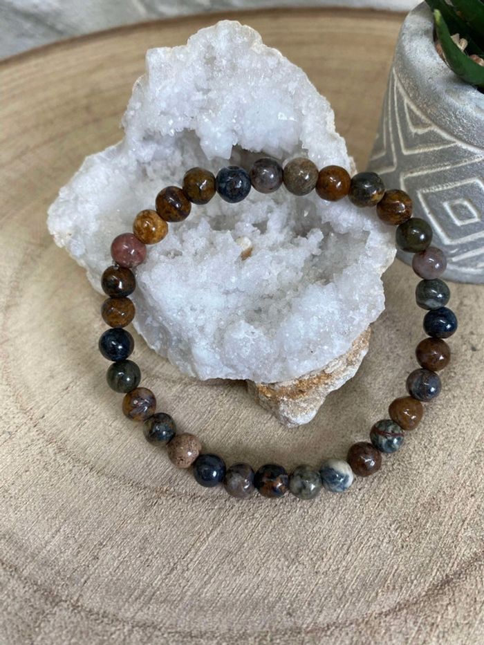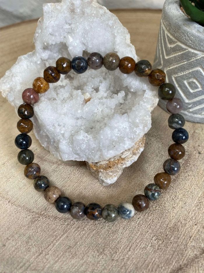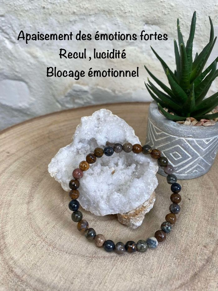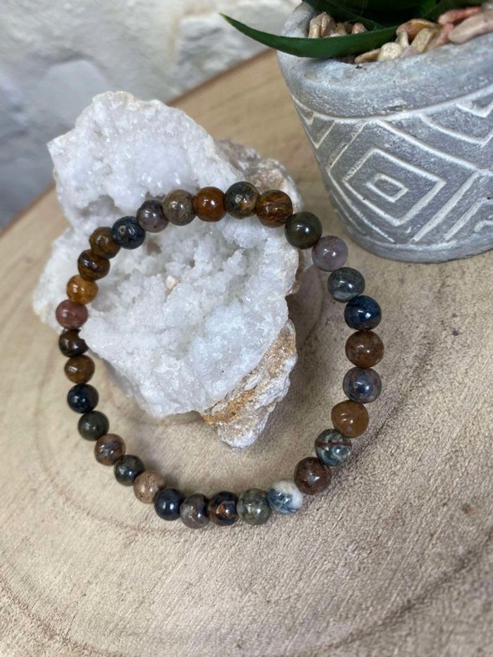 Bracelet de lithothérapie en pierres naturelles de pietersite Taille 18 cm , perles de 6 mm la pietersite sur le plan psychique pierre d’équilibre entre la perception des besoins réels et des aspirations.     Cette pierre permet de se libérer des traumatismes et des blessures émotionnelles engendrés par le contact de personnes perverses narcissiques ou dominatrices.    Elle développe le sentiment de bien-être et aide à avancer dans la vie. Elle enseigne l’importance d’être et non de paraître.   C’est une pierre positive, motivante et stimulante. Elle éloigne les influences néfastes, les idées noires et l’anxiété. Elle contribue à améliorer la confiance en soi et l’estime de soi. Parallèlement, elle libère de la susceptibilité et des complexes d’infériorité.  La pietersite favorise l’imagination, la créativité, et l’esprit critique. Elle aide à avoir un dialogue posé avec une voix fluide et harmonieuse. Ainsi, elle incite à gagner en éloquence. Elle est également réputée pour augmenter la capacité d’écoute.    Cette pierre permet de pouvoir faire face aux difficultés et aux problèmes les plus complexes. Elle apporte force et détermination pour atteindre ses objectifs.    Elle aide à garder la maîtrise de la situation lors de changements ou de nouveaux départs. Elle supprime le stress de l’inconnu, redonne de l’assurance et lutte contre l’incertitude et l’indécision.   sur le plan physique   La pietersite est réputée pour stimuler le métabolisme. Elle donne la faculté d’avoir une hygiène de vie saine. Elle incite son porteur à manger équilibré et à pratiquer une activité physique. Cette pierre donne le courage de tenir ses objectifs.    Composée d'œil de faucon, la pietersite est recommandée pour la vision. 62 #laetis0507pietersite