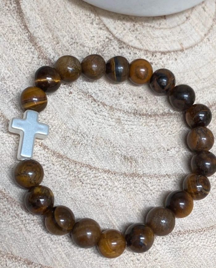 Bracelet œil de tigre et croix blanche 18 cm , lithothérapie - photo numéro 1