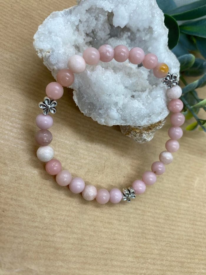 Bracelet opale rose et fleurs 19,5 cm , lithothérapie - photo numéro 1