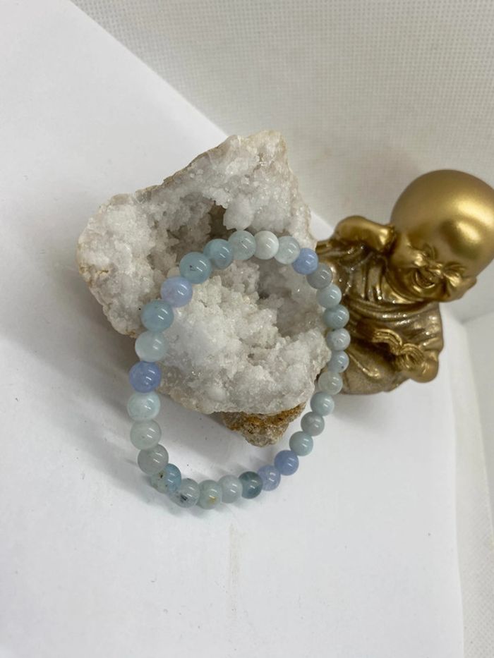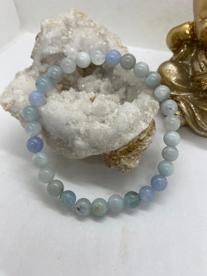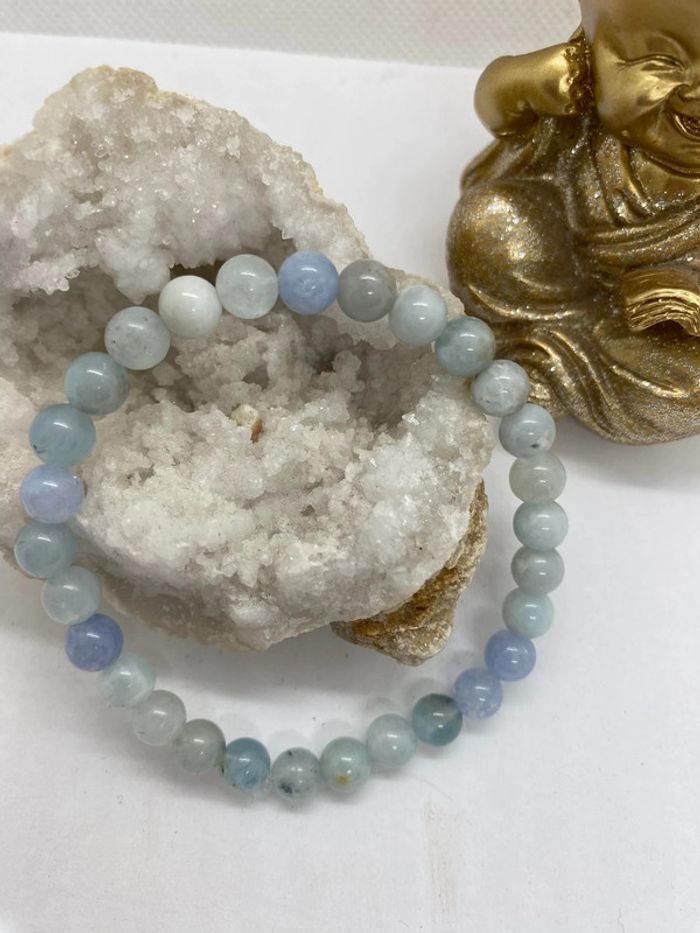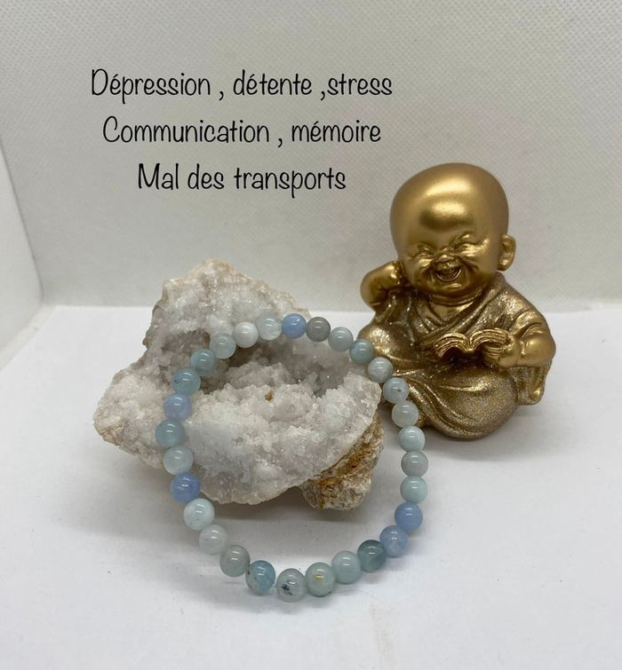 Très jolie et très doux ce bracelet de lithothérapie en pierres naturelles d’aigue marine Taille 18 cm , perles de 6 mm , jamais utilisé Aigue marine aide à soulager la toux. Elle peut également servir à réduire les problèmes respiratoires et apaiser les cordes vocales. L’Aigue-Marine permet de calmer les douleurs oculaires, notamment les migraines. Associée à la mer et aux océans, l’Aigue-Marine aide à combattre le mal de mer. Partir en bateau avec un bracelet d’Aigue-Marine empêche les vomissements et maux de ventre. Ces effets fonctionnent également pour les personnes malades en voiture ou en bus. Propriétés psychiques l’Aigue-Marine accompagne le mental à se détendre. C’est une pierre qui aide à combattre le stress et favorise des pensées positives. Ses vibrations diminuent l’anxiété pour faire place à la paix intérieure. Elle renforce l’intellect et la mémorisation. C’est pourquoi elle accompagne souvent les étudiants avant un examen. Particulièrement pour les oraux, car elle facilite la prise de parole et la communication. Elle renforce les sentiments amicaux et amoureux. Elle s’offre lors des fiançailles et permet de consolider les couples. Elle rend la communication plus douce, et ainsi rend les relations plus sincères et facile à conserver. 25a #laetis0507aiguemarine