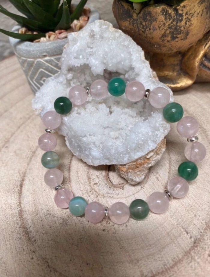 Très joli bracelet de litho en pierres naturelles d’agate verte et quartz rose Taille 18,5 cm , perles de 8 mm L’agate -l’agate agit sur les yeux - l’agate fortifie les poumons, l’estomac, le foie et le cerveau - Elle stimule la digestion et l’élocution - Elle est très efficace pour les maux de tête, les crampes et le douleurs dorsalgie - Elle écarte les énergies négatives - Elle dissout les blocages et les barrages à l’intérieur de notre corps Effets réputées sur le plan mental et émotionnel : elle renforce le moral et donne ainsi de l' Elan pour aller de l'avant et réussir ce que l'on entreprend . Quartz rose La pierre quartz rose est une pierre porteuse de paix, d’amour et d’amitié. Elle aide ceux qui la portent à pardonner, mais aussi à respecter, aussi bien eux-mêmes qu’autrui. Elle accompagne les personnes en état de choc et favorise la rapidité dans la cicatrisation, qu’elle soit physique ou morale. Elle est reconnue pour ses vertus apaisantes, 100b #laetis0507quartzrose #laetis0507agateverte