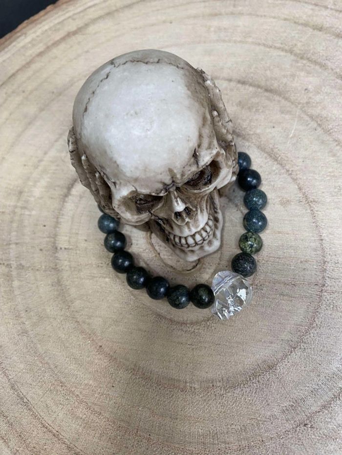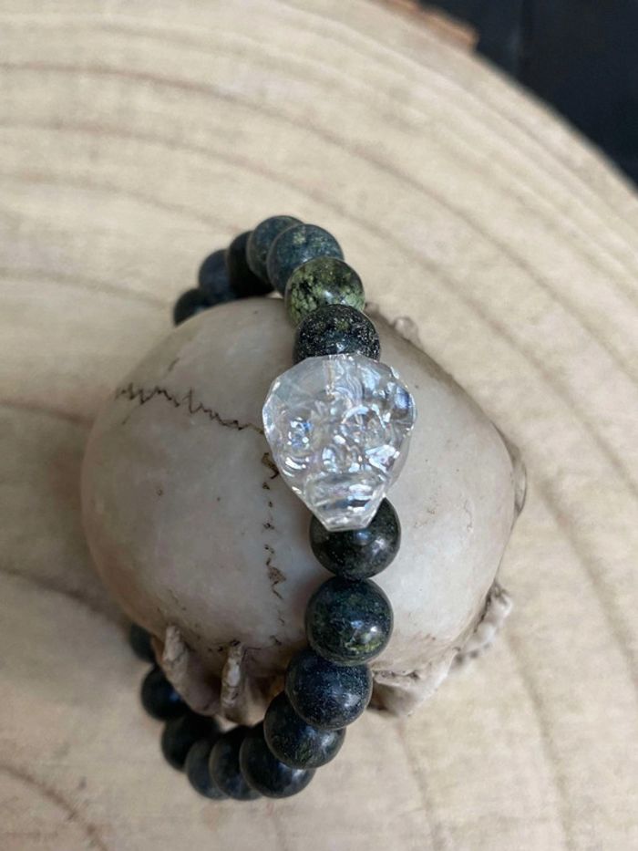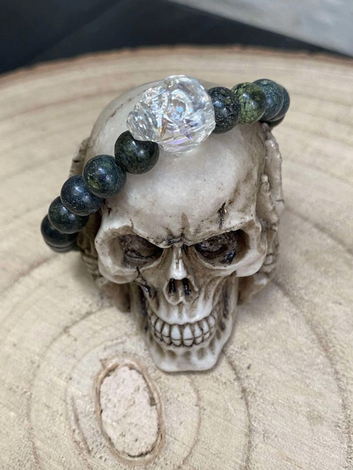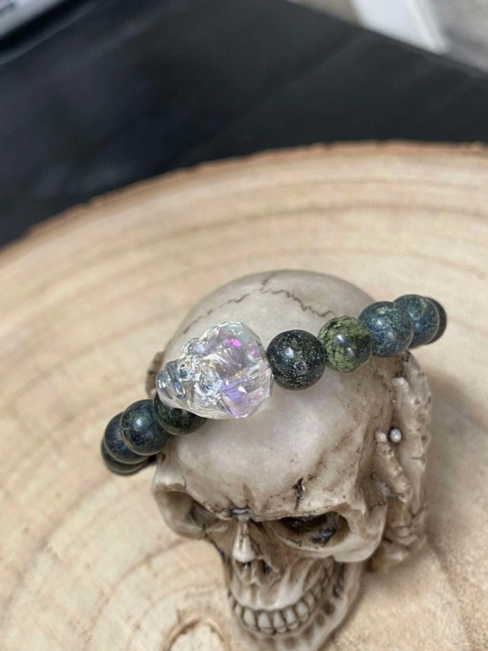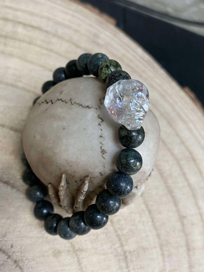 Racelet de lithothérapie en pierres naturelles de serpentine avec tête de mort transparente ( désolée pour la photo , la mise en valeur n’est pas facile ) Taille 19 cm , perles de 8 mm la Serpentine aide à régénérer les cellules. soulage les douleurs menstruelles. apaise les migraines. stimule le système digestif. favorise la relaxation. protège des ondes invasives. éloigne le stress et l'anxiété Ses vibrations permettent à l’esprit de rester concentré sur une activité. Elle aide à se libérer des tensions et lutte contre la fatigue chronique. Associé au chakra frontal, la serpentine verte possède un puissant pouvoir calmant. Elle agit en particulier sur les maux de tête et les migraines qu'elle permet à la fois de prévenir et de réduire en intensité. aide à lutter contre le diabète et diminue ses effets. 74b #laetis0507serpentine #laetis0507tetedemort