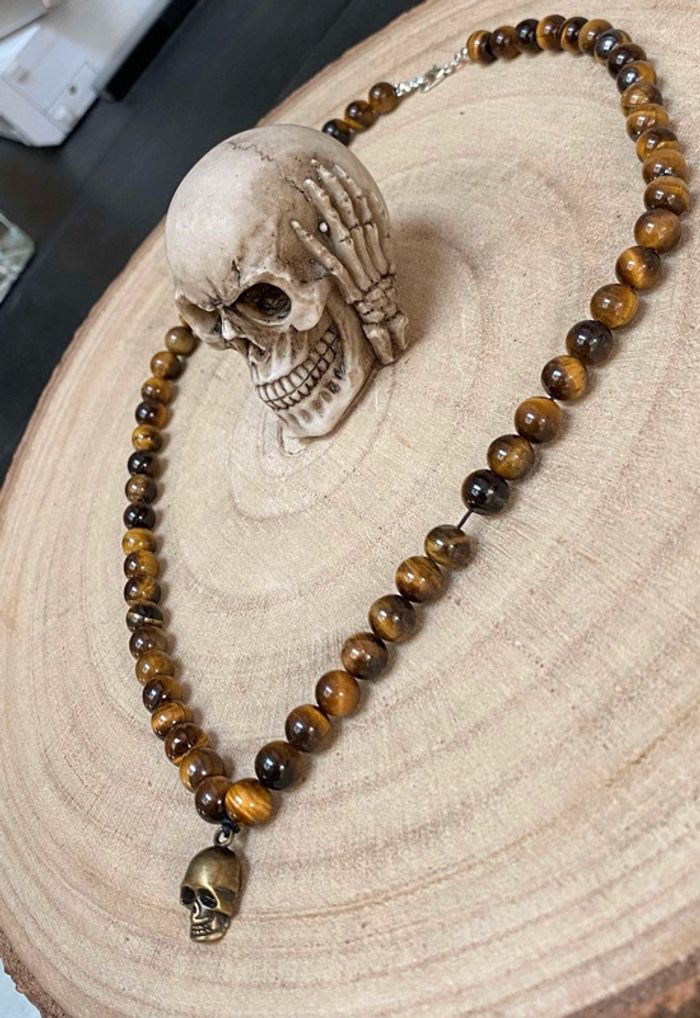 Collier homme œil de tigre et tête de mort 54 cm , lithothérapie - photo numéro 1