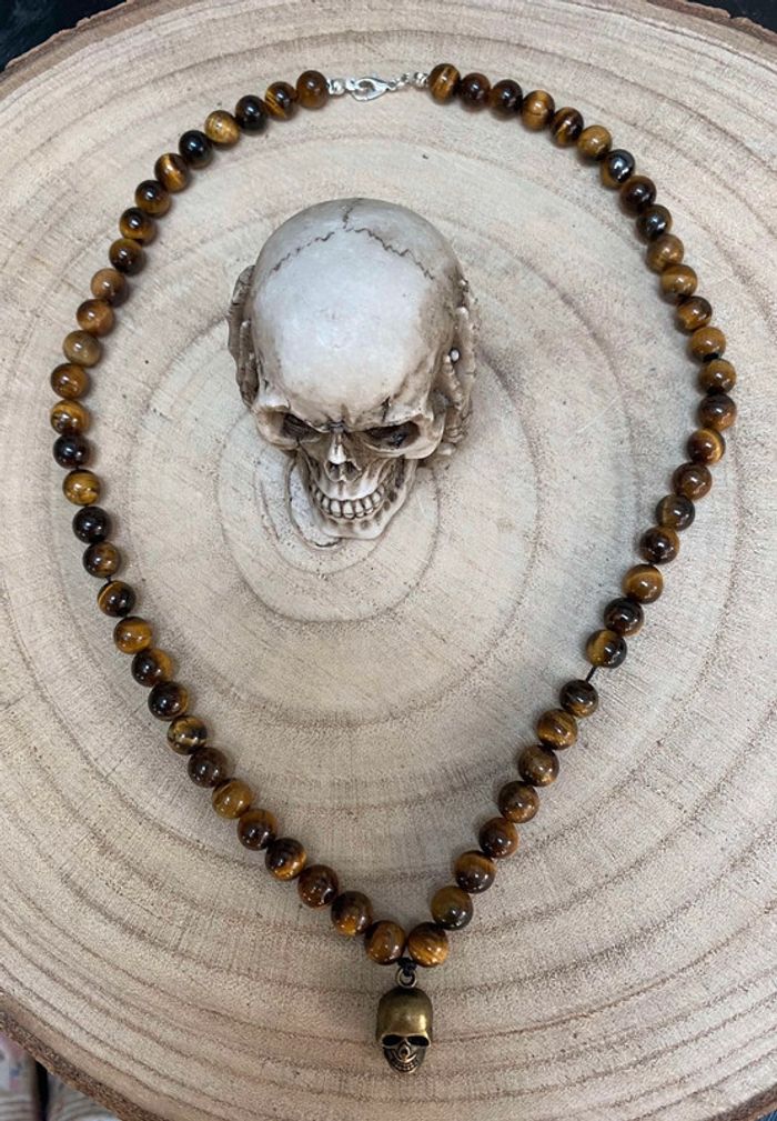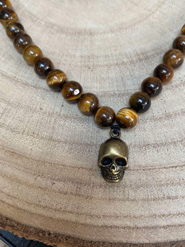 Collier homme œil de tigre et tête de mort 54 cm , lithothérapie