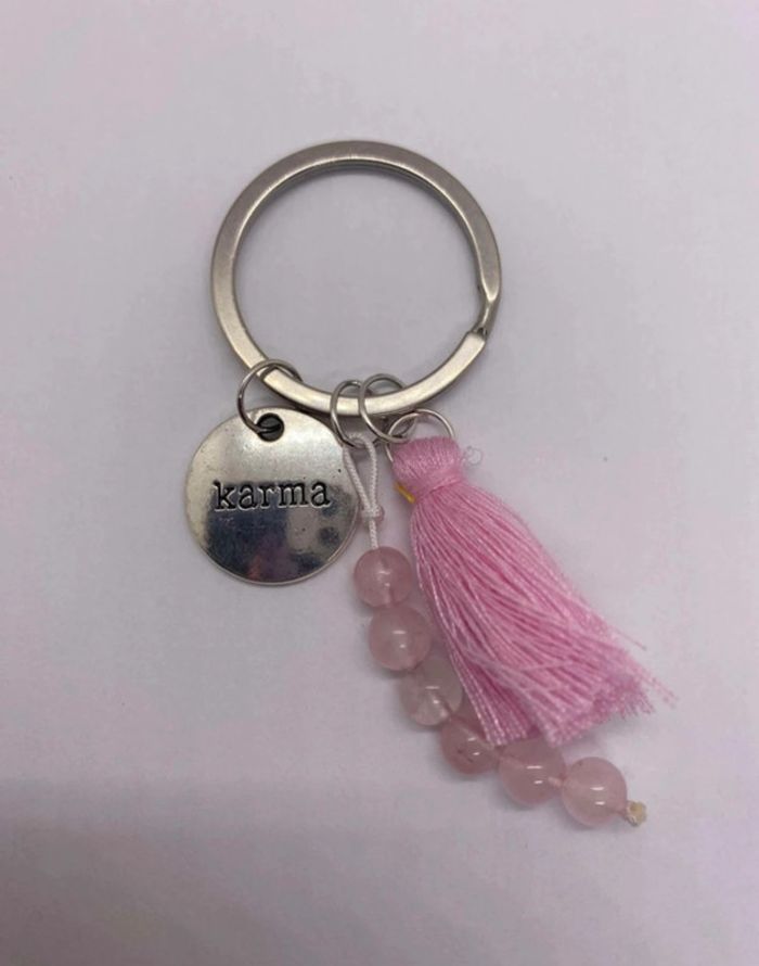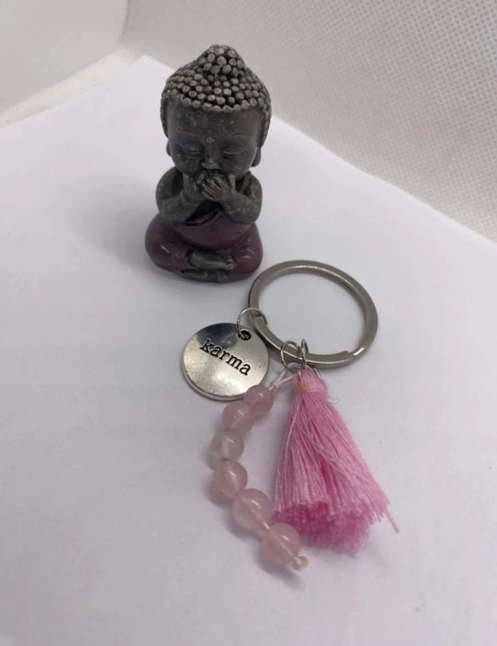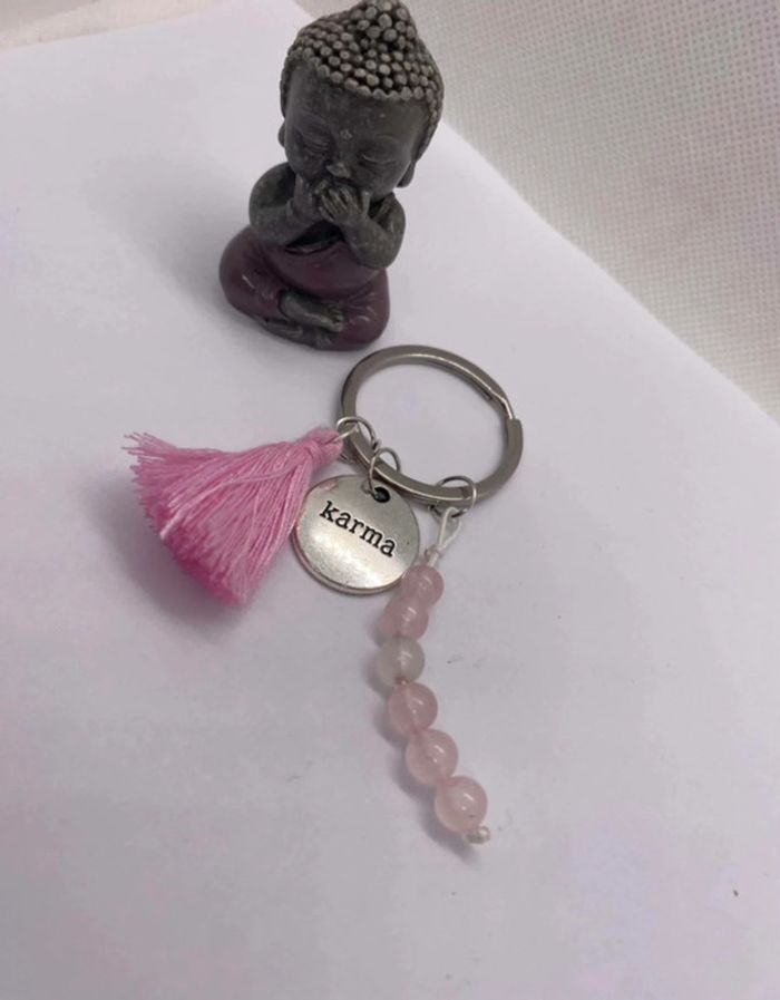 Très joli porte clefs « amour et karma «  avec perles naturelles de quartz rose en 6 mm Quartz rose La pierre quartz rose est une pierre porteuse de paix, d’amour et d’amitié. Elle aide ceux qui la portent à pardonner, mais aussi à respecter, aussi bien eux-mêmes qu’autrui. Elle accompagne les personnes en état de choc et favorise la rapidité dans la cicatrisation, qu’elle soit physique ou morale. Elle est reconnue pour ses vertus apaisantes. #quartzrose #laetis0507quartzrose #porteclés #laetis0507porteclefs #porteclef #karma