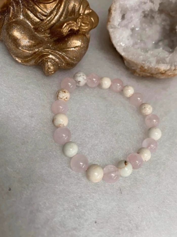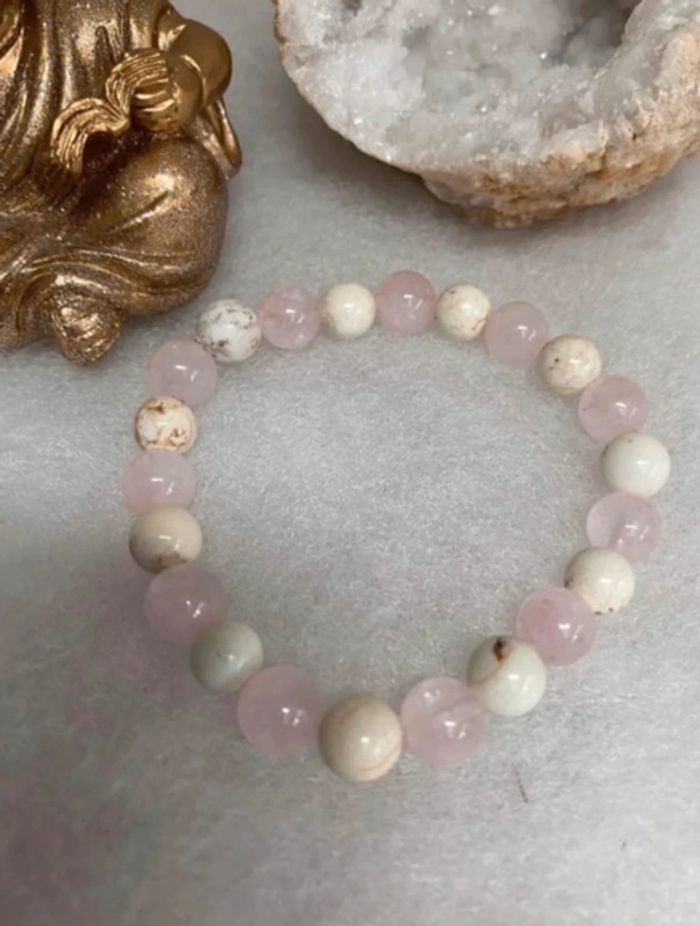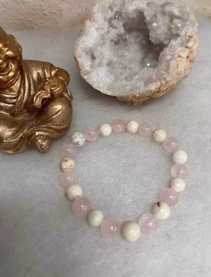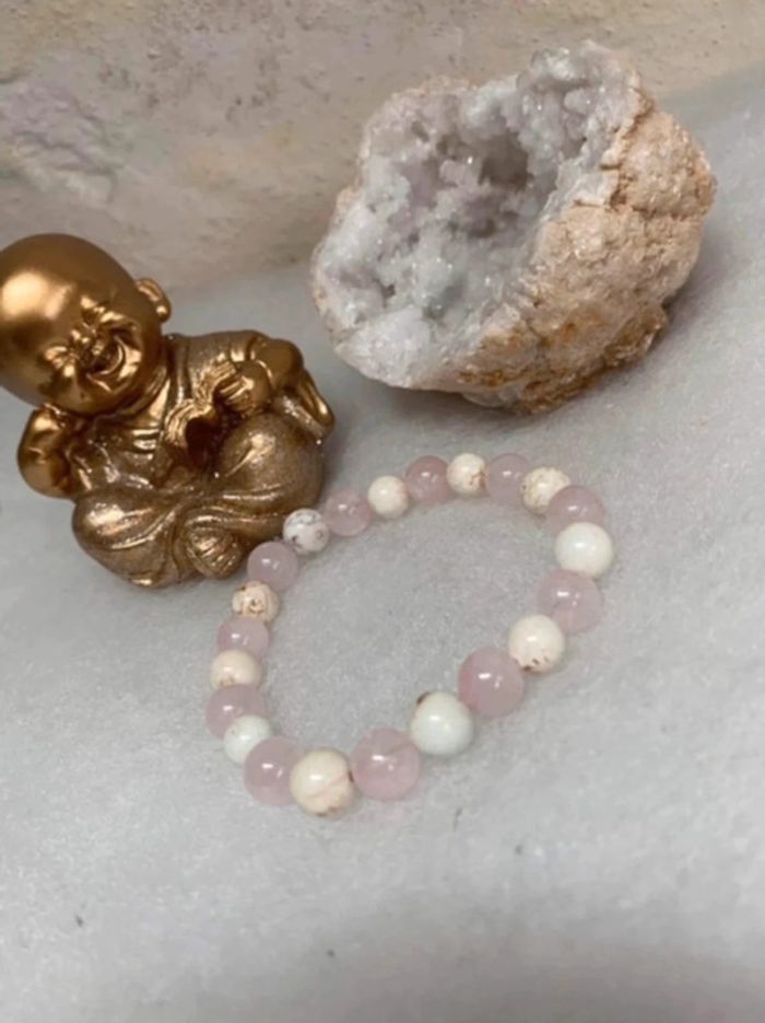 Très joli bracelet de lithothérapie en pierres naturelles de quartz rose et magnesite Taille 18,5 cm , perles de 8 mm , jamais porté Quartz rose La pierre quartz rose est une pierre porteuse de paix, d’amour et d’amitié. Elle aide ceux qui la portent à pardonner, mais aussi à respecter, aussi bien eux-mêmes qu’autrui. Elle accompagne les personnes en état de choc et favorise la rapidité dans la cicatrisation, qu’elle soit physique ou morale. Elle est reconnue pour ses vertus apaisantes, La magnésite La magnésite aide à combler les carences en magnésium Elle soulage les migraines , maux de tête , mais aussi les crampes musculaires ou abdominales , lutte contre la constipation, améliore le fonctionnement du foie et de l’estomac. Fortifie les cheveux , les ongles , les os Elle est apaisante , relaxante , réduit le stress , calme les angoisses , diminue l’irritabilité améliore la patience . 21 #laetis0507magnesite #laetis0507quartzrose
