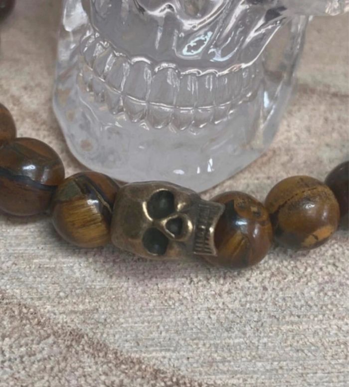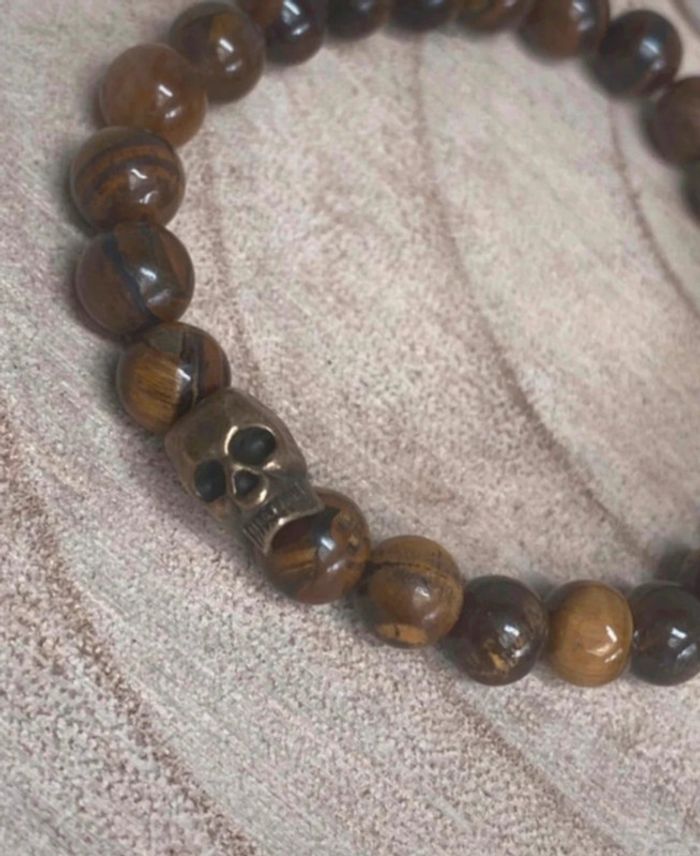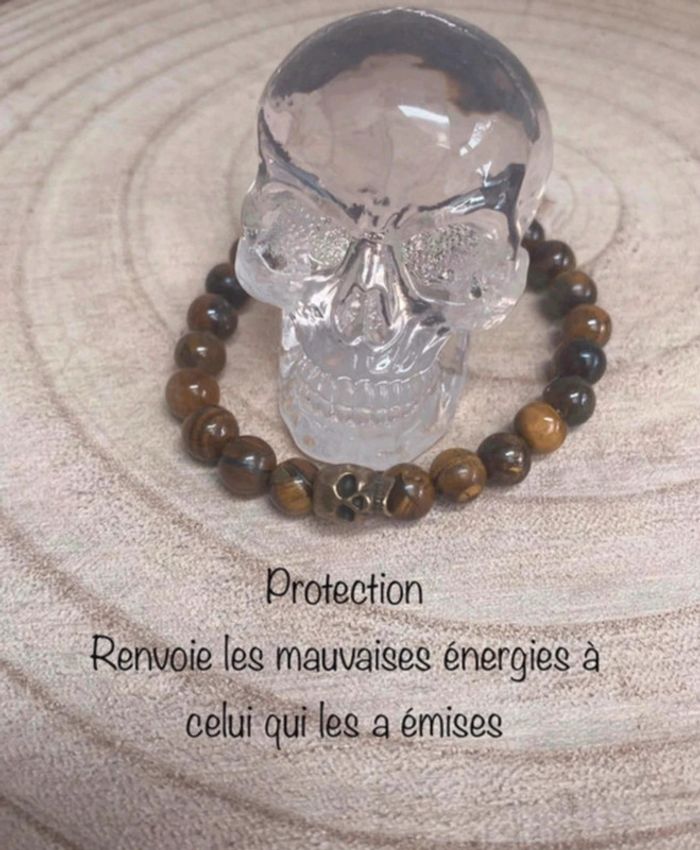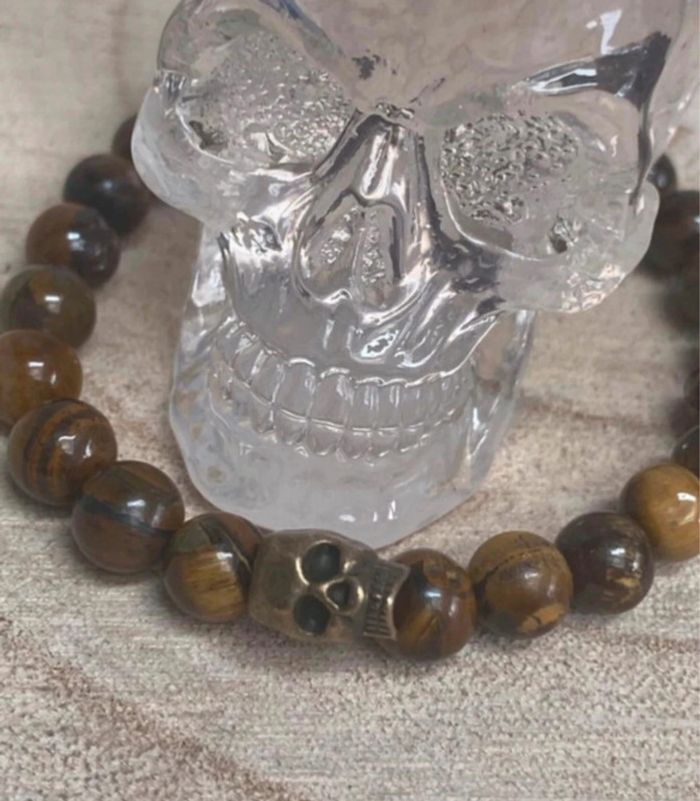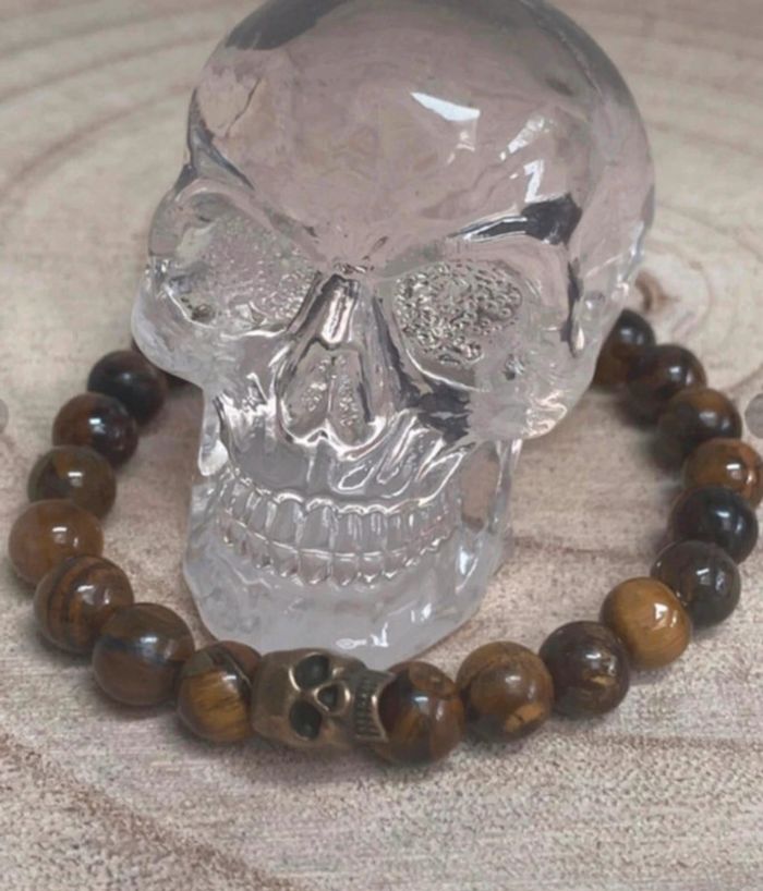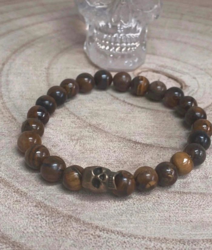 Bracelet de lithothérapie en pierres naturelles d’œil de tigre avec tête de mort couleur doré Taille 21 cm , perles de 8 mm , jamais utilisé Œil de tigre Grâce aux vertus de la pierre qui le compose, le bracelet œil de tigre constitue un véritable barrage contre les énergies négatives et les malédictions. Il agit même comme un miroir et renvoie ces ondes négatives vers l'objet ou la personne qui les a émises. 110 #laetis0507oeildetigre #laetis0507tetedemort