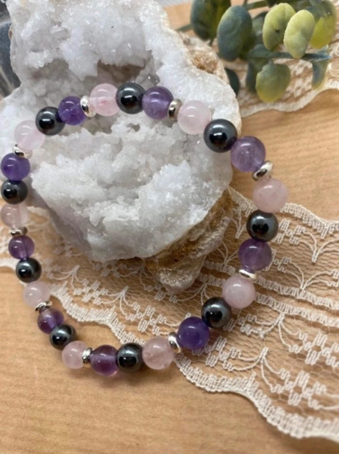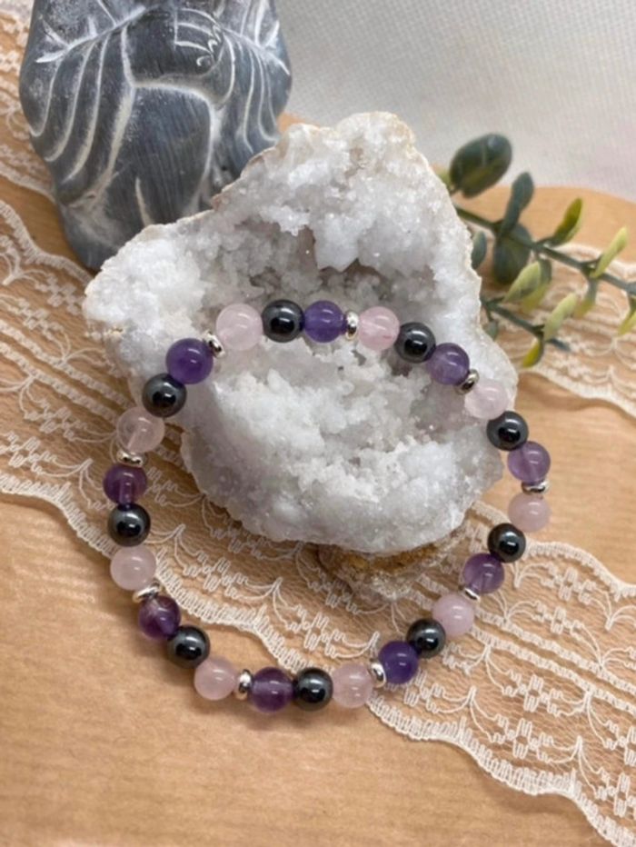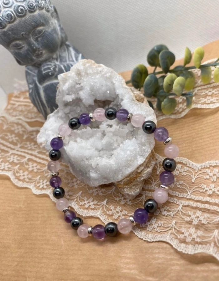 bracelet fin de lithothérapie en pierres naturelles de quartz rose , améthyste et Hematite , pour trouver la sérénité Taille 18,5 cm , perles de 6 mm ✨Amᥱ́thყstᥱ✨ Pierre anti stress par excellence , elle permet la paix intérieure , procure un sommeil plus apaisé et plus profond, elle permet aussi de combattre les pensées obsessionnelles et les addictions. En apportant la paix de l'esprit, elle aide à stimuler la production de sérotonine, l'hormone du bien-être. Elle est considérée comme la pierre de l'humilité, de la sérénité et de la sagesse. Elle stimulerait la créativité, l'imagination et la clarté, en favorisant la relaxation, la concentration et la méditation. Elle permet de lutter contre les addictions Hématite équilibre le corps et l'esprit. renforce la confiance en soi. facilite la communication. régule l'afflux sanguin. éloigne les mauvaises énergies. aide à lutter contre les excès. combat les symptômes dépressifs. Quartz rose La pierre quartz rose est une pierre porteuse de paix, d’amour et d’amitié. Elle aide ceux qui la portent à pardonner, mais aussi à respecter, aussi bien eux-mêmes qu’autrui. Elle accompagne les personnes en état de choc et favorise la rapidité dans la cicatrisation, qu’elle soit physique ou morale. Elle est reconnue pour ses vertus apaisantes. 47 #laetis0507quartzrose #laetis0507hematite #laetis0507amethyste