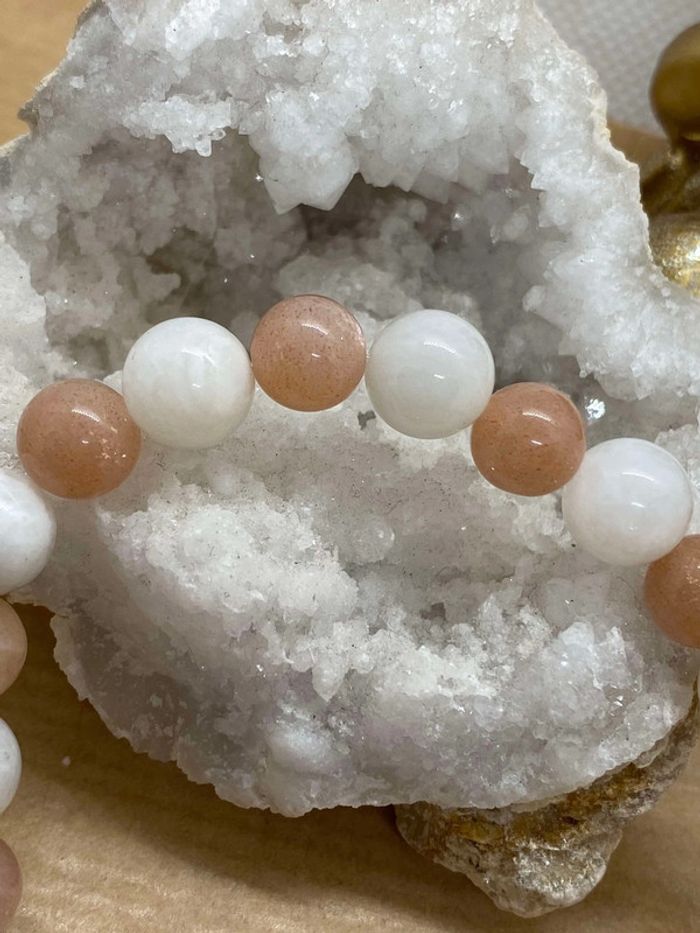 Très joli bracelet de lithothérapie dédié à la féminité Perles naturelles de pierre de lune et pierre de soleil Taille 17,5 cm , perles de 7 et 8 mm ☀️La pierre de soleil ☀️ Presque impossible d’être triste ou déprimé avec cette pierre, son rayonnement apporte optimisme et joie de vivre, donne envie d’aller vers les autres, favorise les nouvelles amitiés et rencontres Pierre de calme , de paix elle chasse la timidité , les doutes pour accroître la confiance en soi et traverser les épreuves de la vie , elle est un bon porte bonheur , apporte chance et prospérité, améliore l’intuition et l’empathie Sur le plan physique, elle fait fonctionner le système digestif , améliore le transit , parfaite pour les ulcères ou douleurs gastriques , elle est excellente pour la libido et indiquée contre les dépressions saisonnières . C'est une pierre qui force le corps à s'auto guérir. 🌙Pierre de lune 🌔 Soulage les troubles et douleurs menstruelles et de la ménopause Favorise un meilleur sommeil.😴 Calme l'hyperactivité des enfants. Aide à la guérison des problèmes de peau. Développe l'intuition et la créativité Permet d'activer une bonne digestion. Renforce la fertilité et protège les grossesses.🤰 51