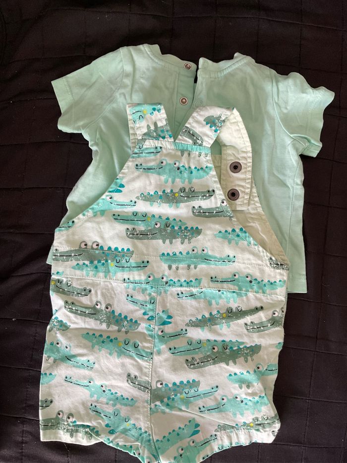 Ensemble salopette courte avec son tee shirt Coton Theme crocodile Vert Clair Du pareil au même Taille 3 mois (59 cm) Très bon état