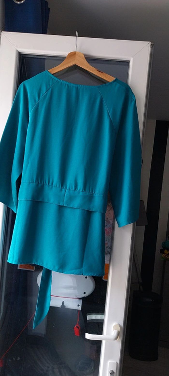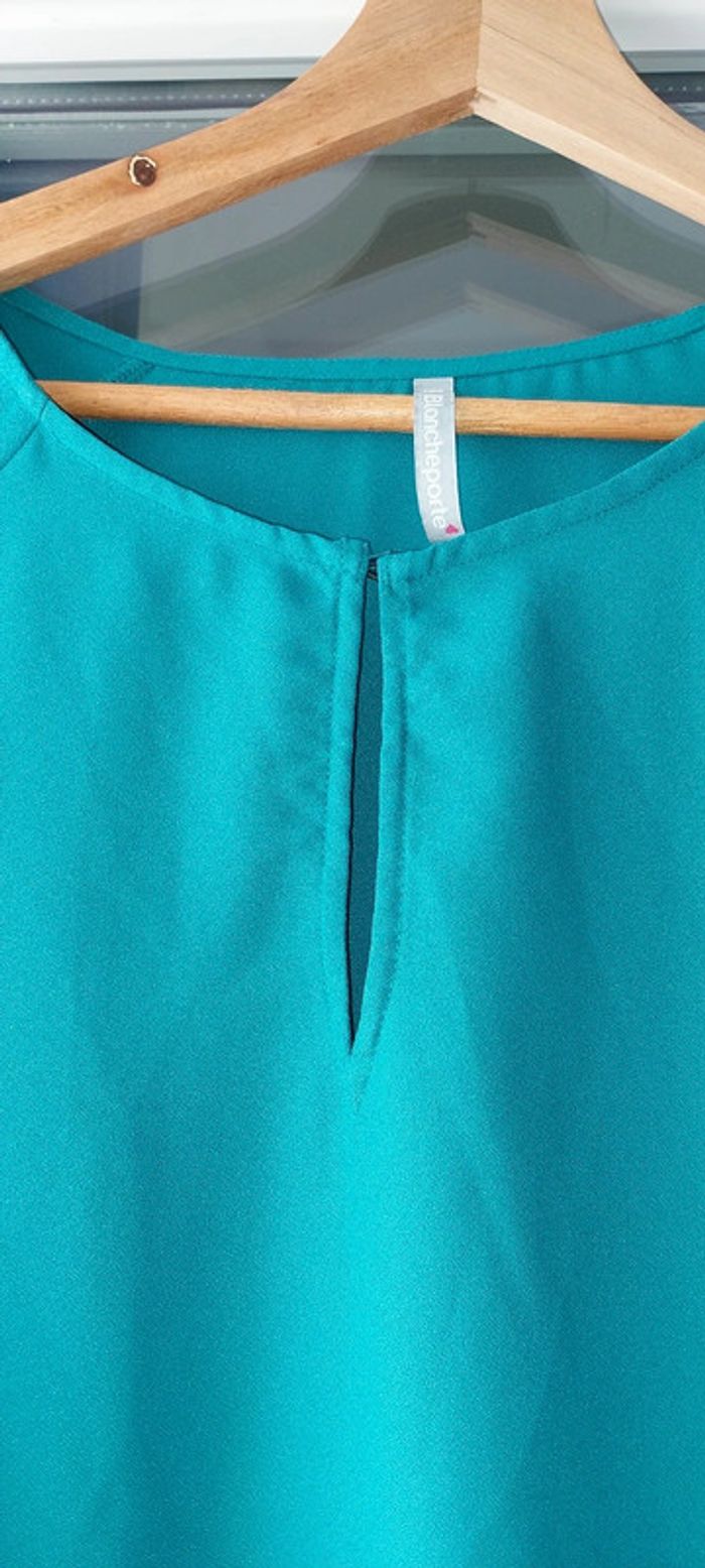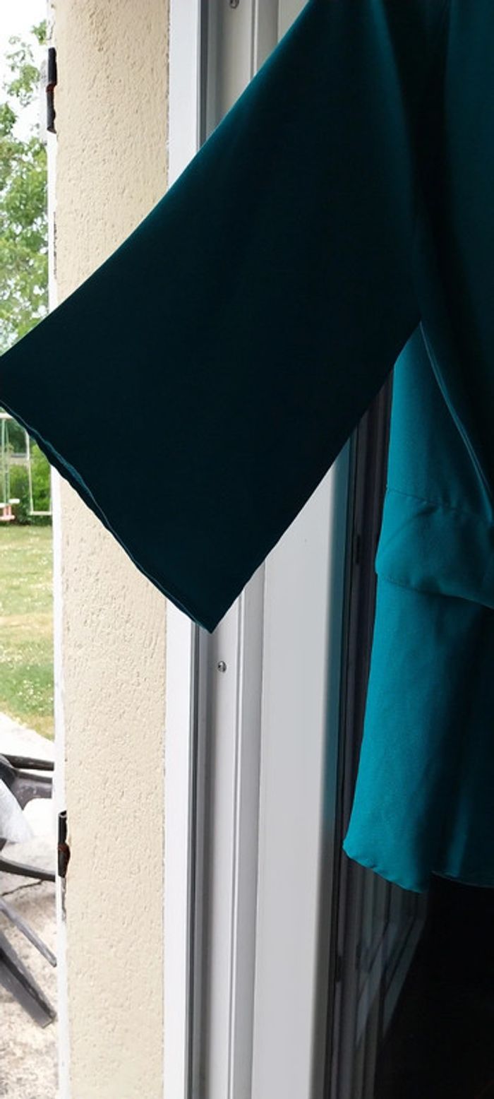 Blouse blancheporte taille 46 mais étiquette coupée. Couleur bleu vert. La bonne couleur se rapproche + de celle de la photo 3. Lien à la taille qui ne s'enlève pas. Manches évasées et 3/4. Bouton au décolleté. 55cm d'aisselle à aisselle