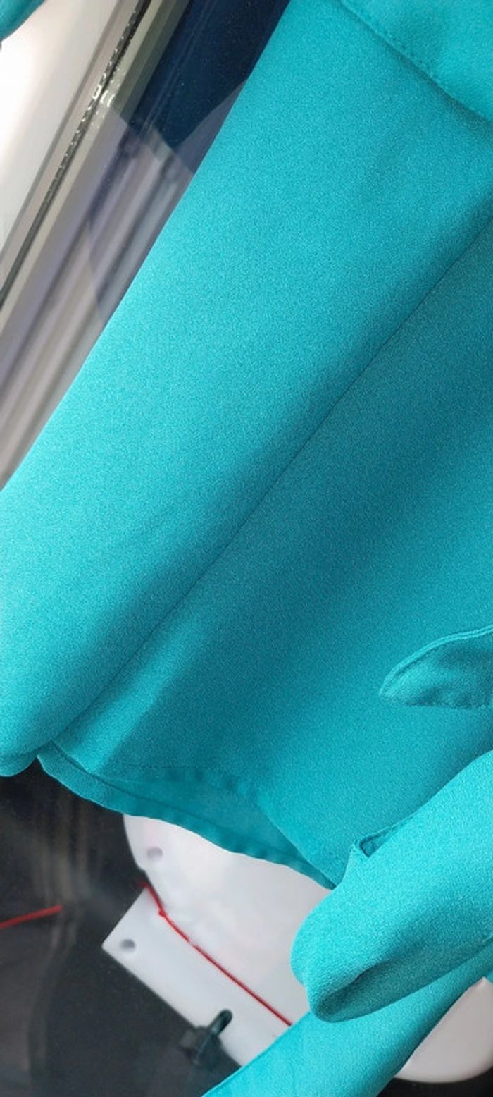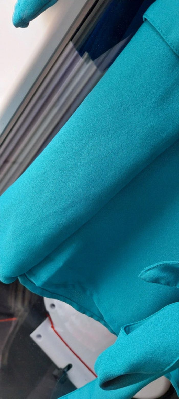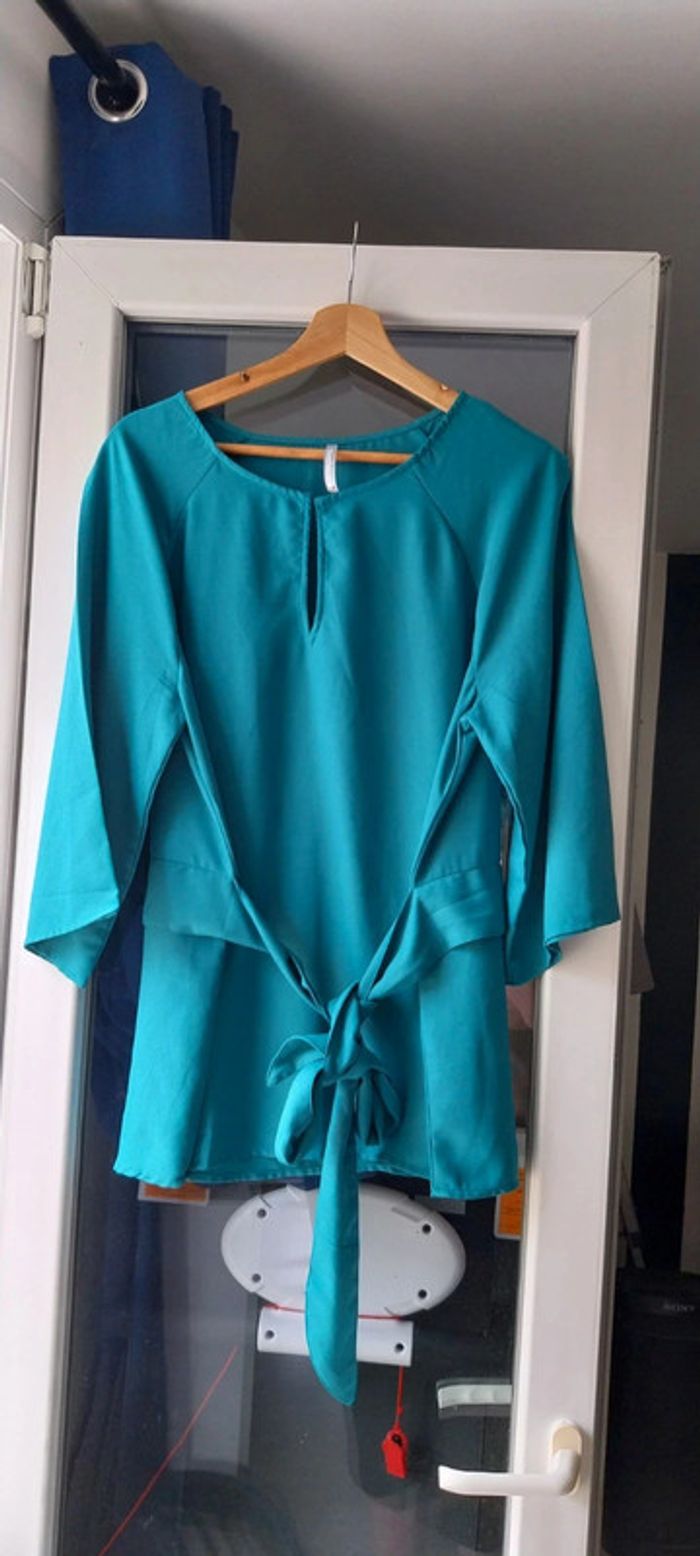 Blouse blancheporte taille 46 mais étiquette coupée. Couleur bleu vert. La bonne couleur se rapproche + de celle de la photo 3. Lien à la taille qui ne s'enlève pas. Manches évasées et 3/4. Bouton au décolleté. 55cm d'aisselle à aisselle