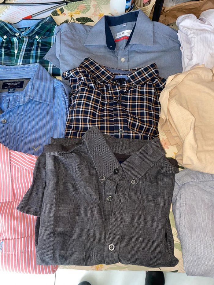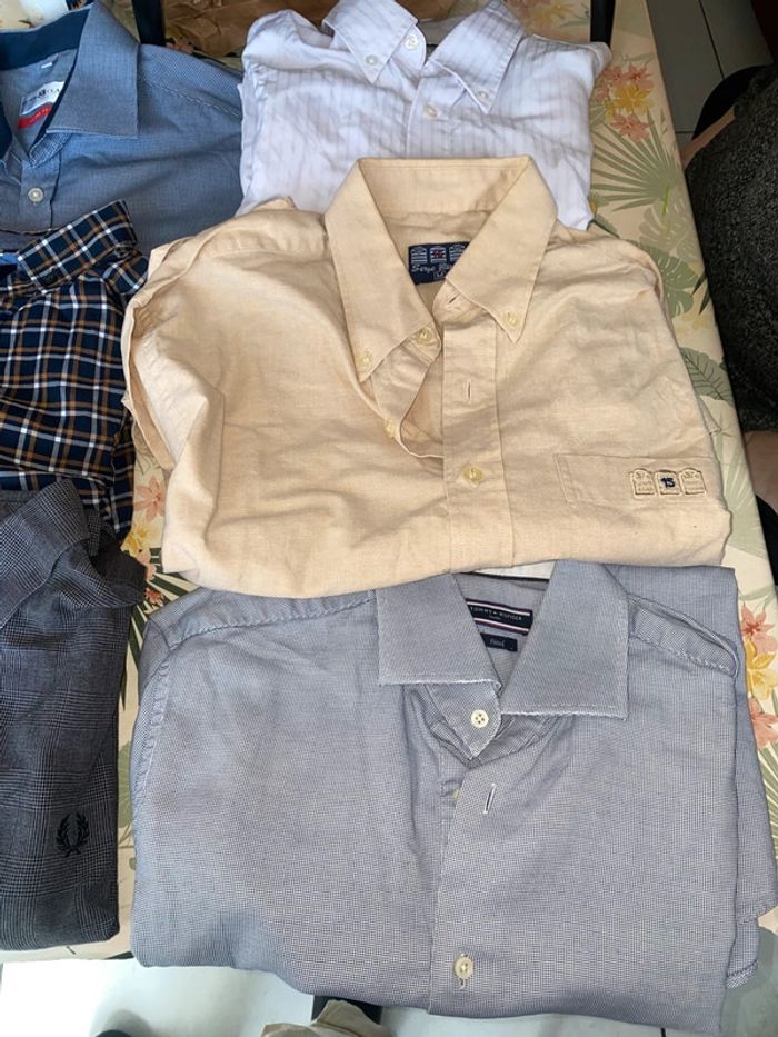Lot de 9 chemises 1 sergent blanco (col tacher ) 1 tommy hilfiger (abîmé au col et manche ) 1 fred Perry 2 crew 1 américain eagle 1 canda 1 royal class 1 Pedro del hierro