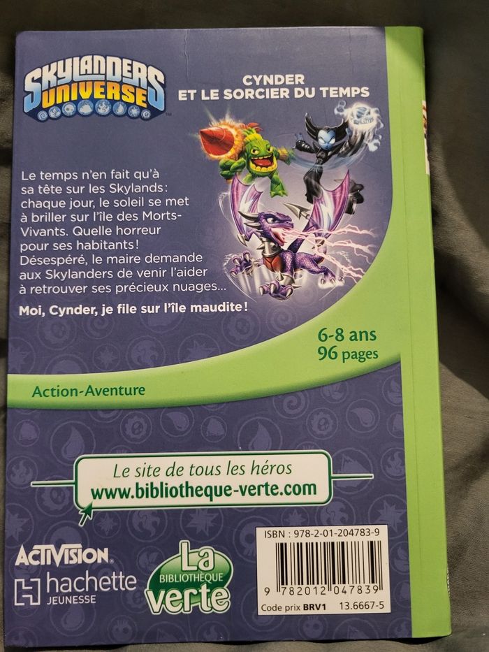 Skylanders universe Tome 5 Cynder et le sorcier du temps bibliothèque verte Attention il y a le nom de l'enfant et une date sur la couverture intérieure. Couverture légèrement abîmée (rayée) Sinon intérieur en très bon état lu 1 fois