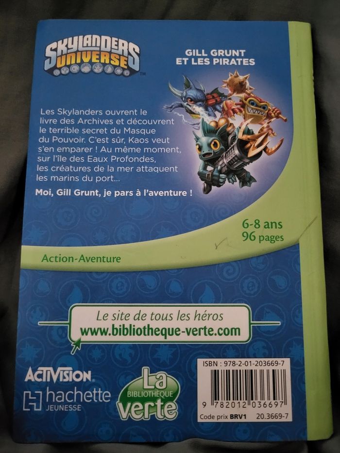 Skylanders universe Tome 2 Gill Grunt et les pirates bibliothèque verte Attention il y a le nom de l'enfant sur la couverture intérieure. Couverture légèrement abîmée (rayée) et e petits coups de crayon sur couverture arrière. (Cf photo) Sinon intérieur en super état lu 1 fois.