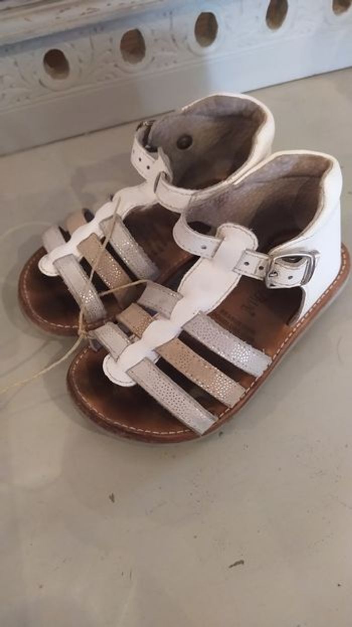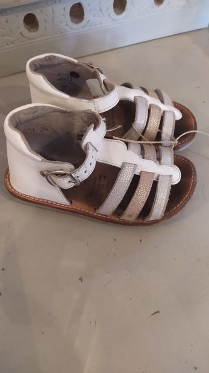 Sandales cuir dessus, doublure et sous pied. Couleur argenté et blanc. Portées quelques fois mais encore en bon état. Pointure 24