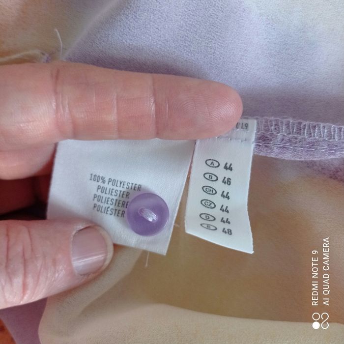 Polyester. Manches courtes. Mesures prises à plat : épaules : 43cm, aisselles : 59cm, longueur : 74cm. C4