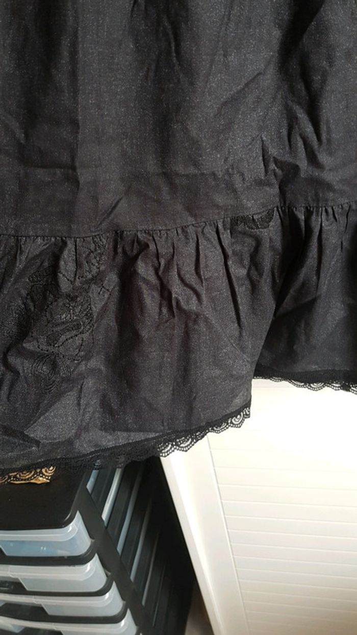 Robe noire PHILDAR légèrement pailletée, encolure carrée bordée de dentelle, petites manches ballons élastiques, dentelle dans le bas et fleurs brodées ton sur ton