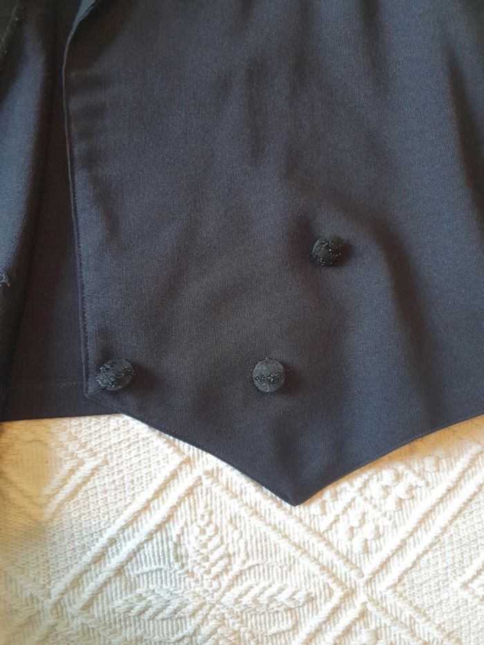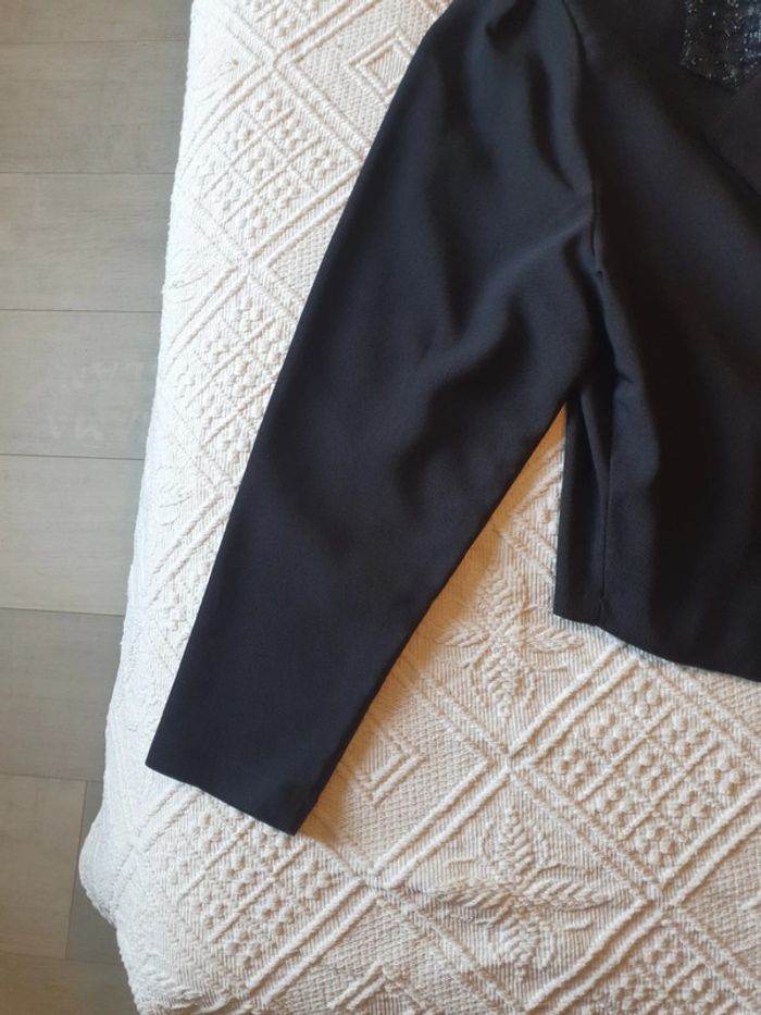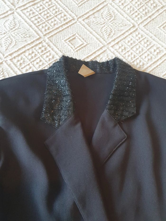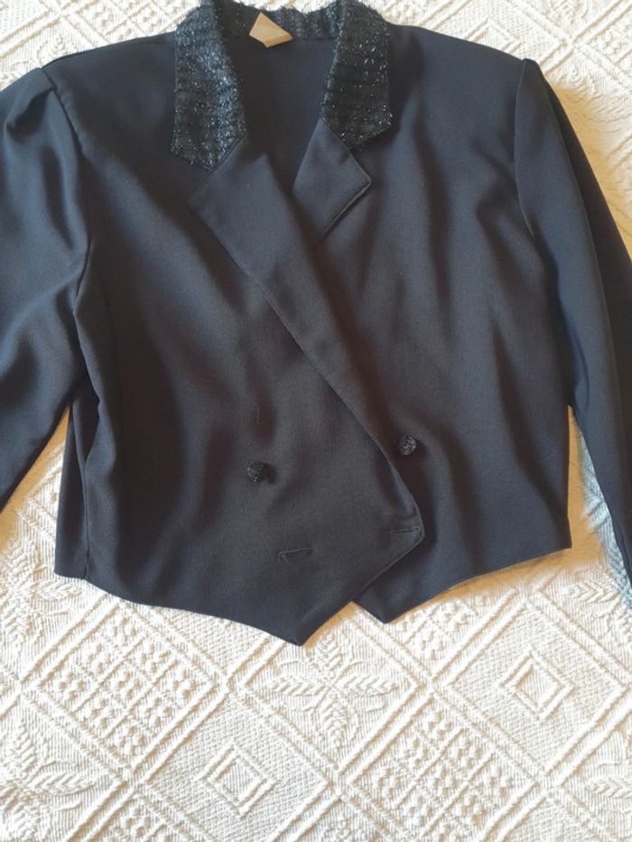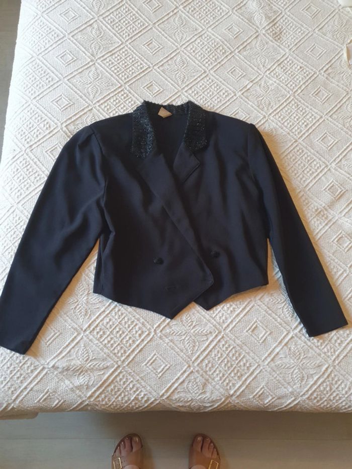 Blazer noir court avec épaulettes, col et boutons noirs brillants, excellent état