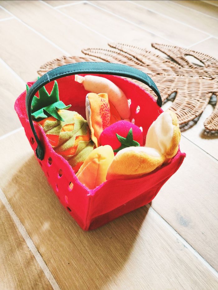 🧺 Dinette Panier rouge anse avec légumes fruits et divers aliments en tissu-peluche