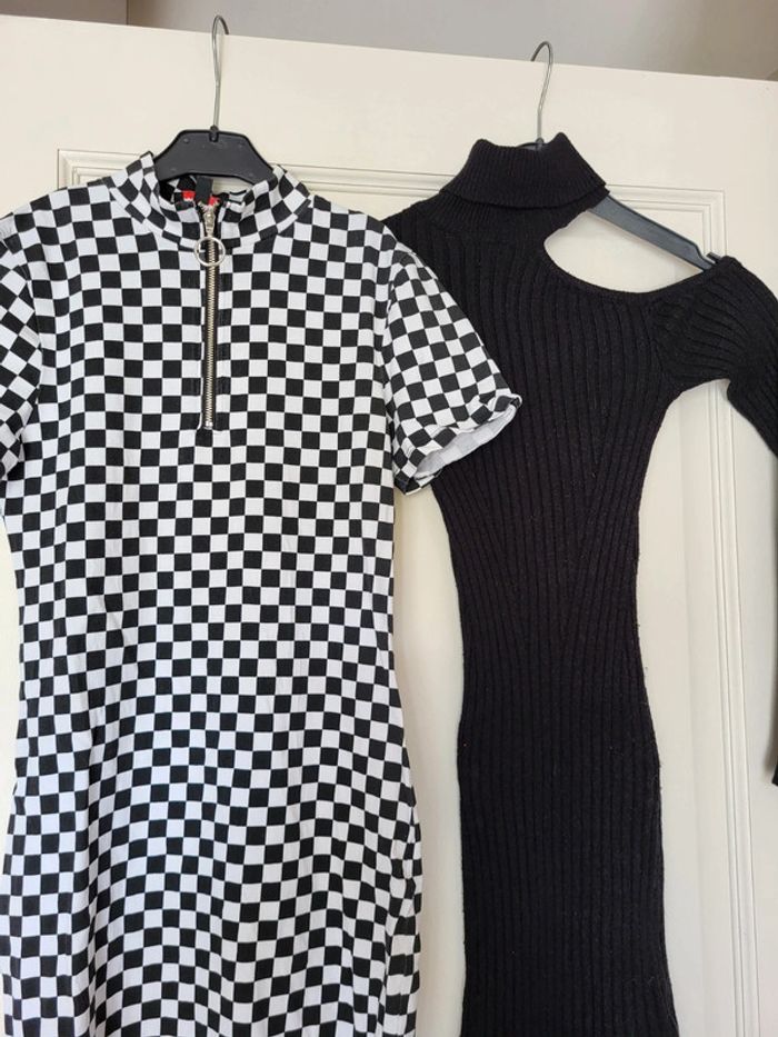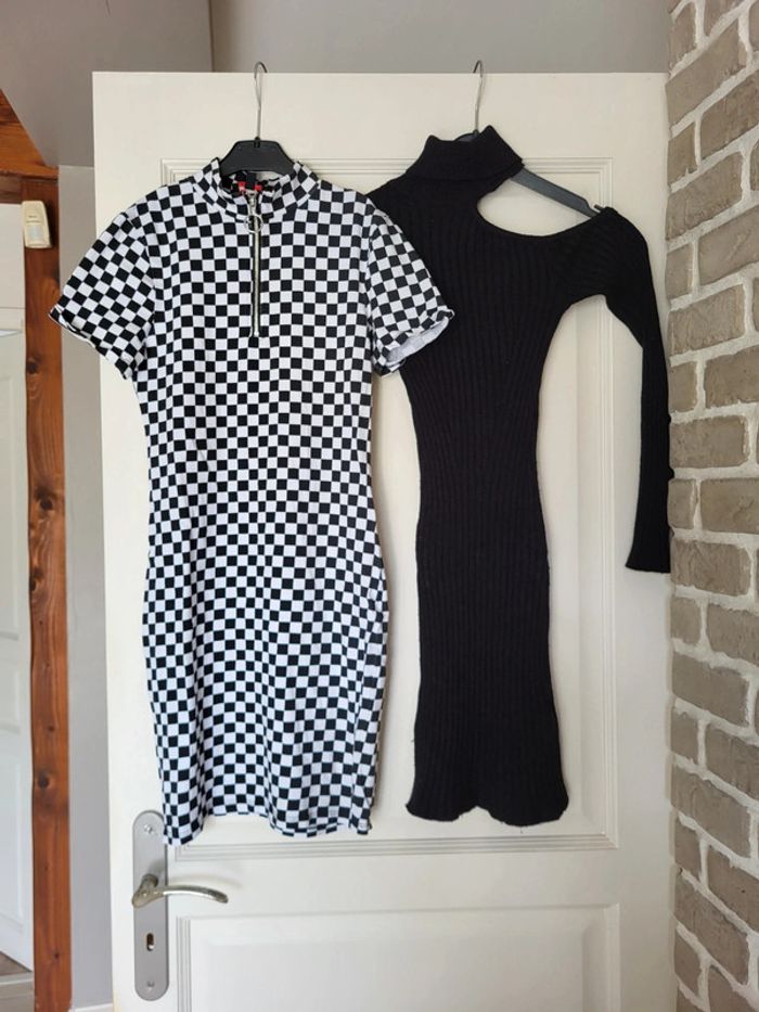 ⭐️ Nombreux articles enfants dans mon dressing et réductions sur les lots ✨️ 🛍 Lot de 2 robes en taille XS / S de Jennyfer qui peuvent convenir à une adolescente de 14 ans Bon état, sans défaut à signaler 👗 Une robe imprimé à carreaux damier noir et blanc avec col zippé et manches courtes Matière extensible 👗 Une robe en maille côtelée noire, douce et extensible Avec col roulé et une épaule dénudée