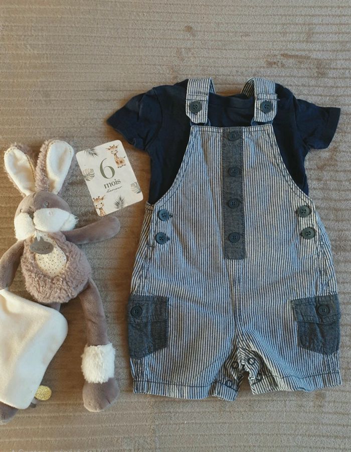 🧾 Ensemble salopette/short et tee shirt uni 🔖 Primark et Plus collection 📏 6 mois (et 3-6 mois mais 68cm) 🎨 Bleu, marine 💲PayPal, Kiabi seconde main, Beebs Pour mes autres articles même taille : #6moisco14 #ensemble #salopette #rayures #garçon #été #teeshirt #rayé