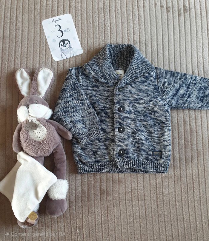 🧾 Gilet maille avec boutons, très bon état 🔖 Tape à l'œil 📏 3 mois - 59cm 🎨 Bleu/Gris 💲PayPal, Kiabi seconde main, Beebs Pour mes autres articles même taille : #3moisco14 #gilet #maille #boutons #garçon #tao