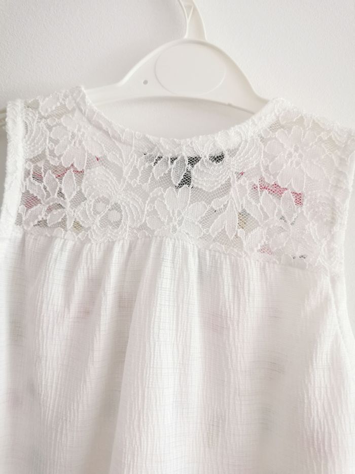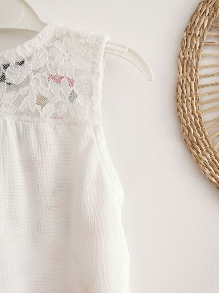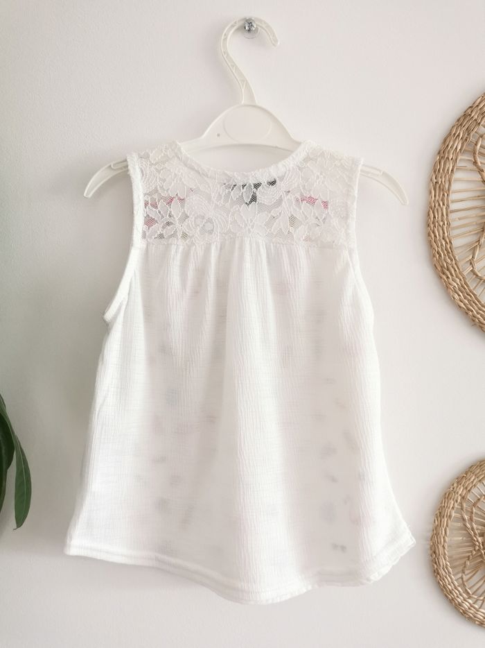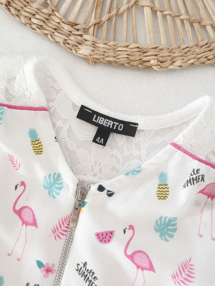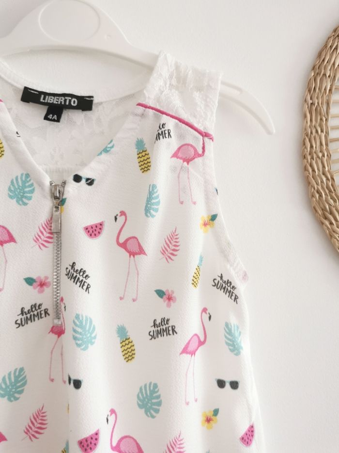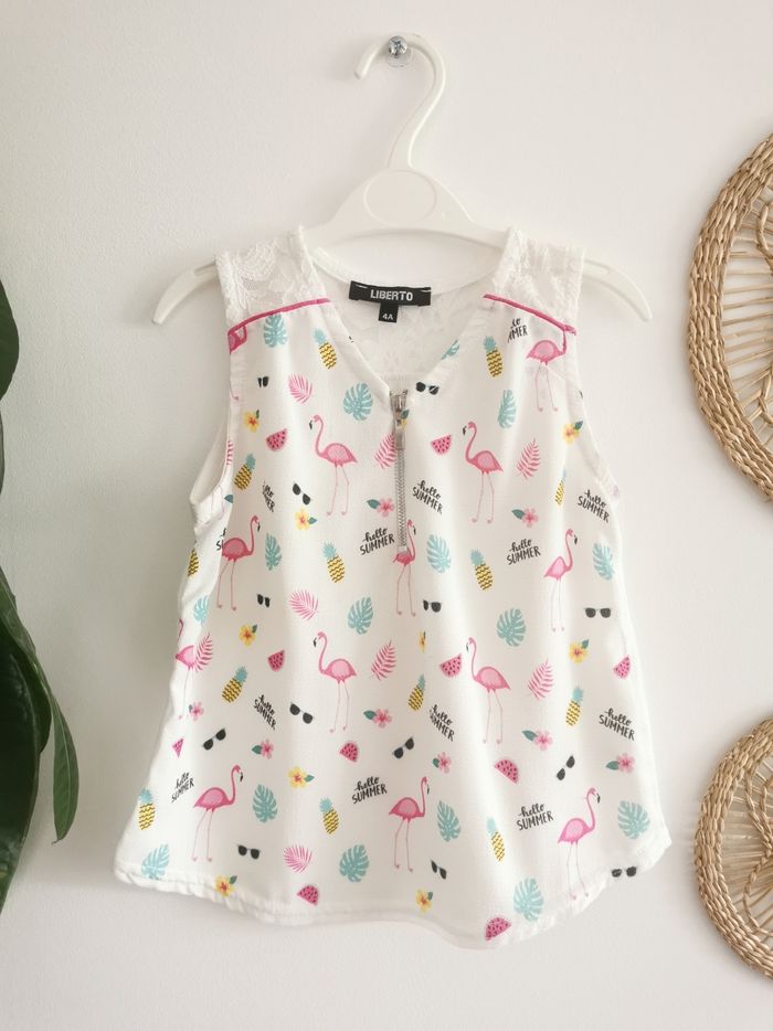 🧑 Débardeur à dentelle 🧑 Liberto 🖊️ ÉTAT ✅️: Parfait 👌 🖊️ DESCRIPTION: ▪️Taille 4 Ans ▪️Matière: polyester - polyamide - elasthanne ▪️Col en V à fermeture zippée ▪️Sans manches ▪️Empiècement à dentelle florale en haut du dos ▪️Imprimé flamands rose 🦩, ananas 🍍 et pastèque 🍉 à l'avant ▪️Couleur: Blanc ⚪️ #SoStyLiFilleTaille4Ans