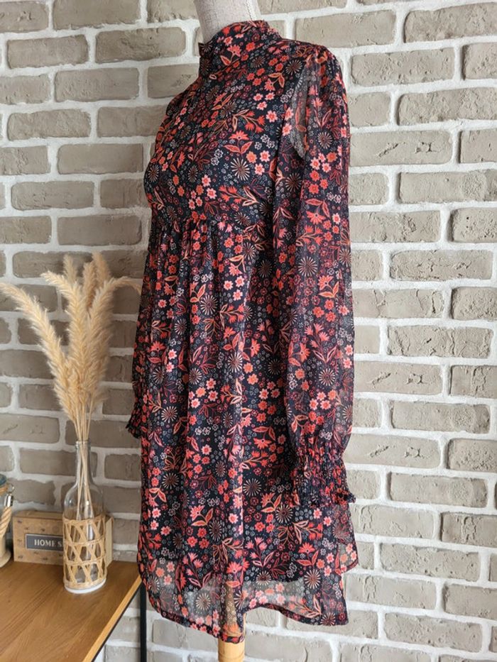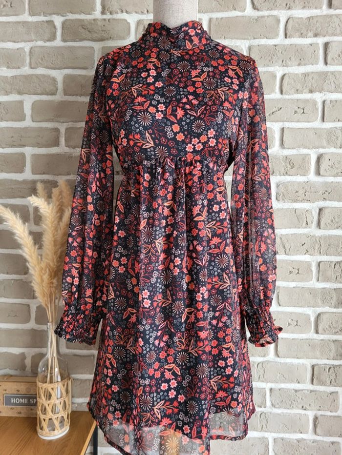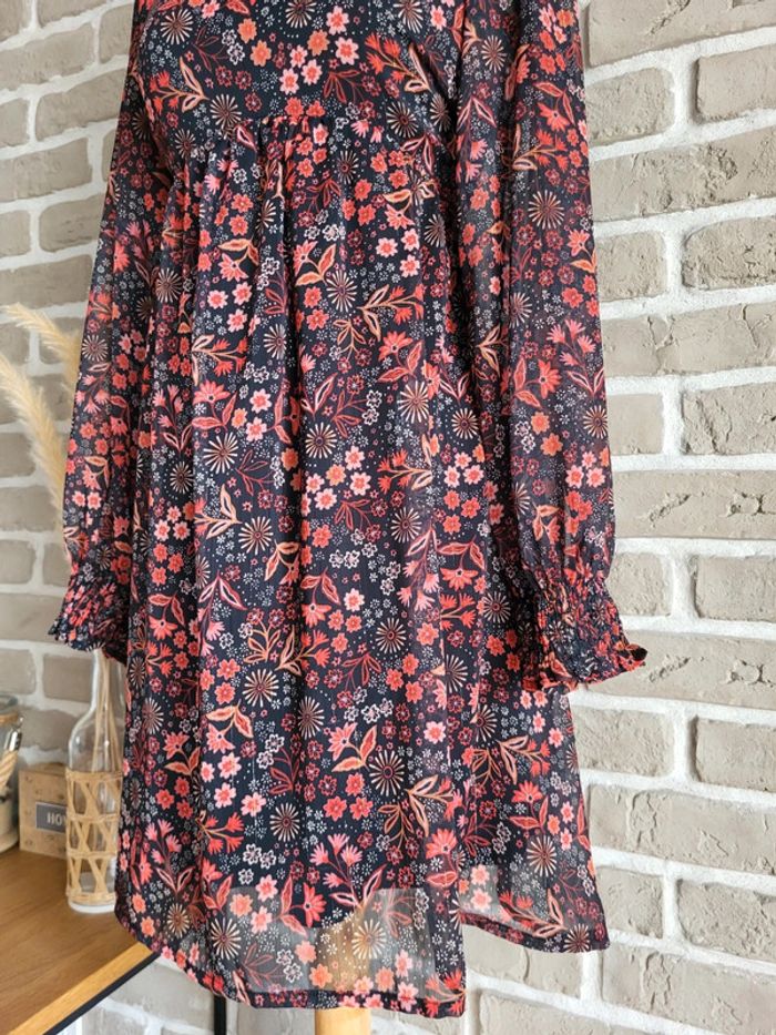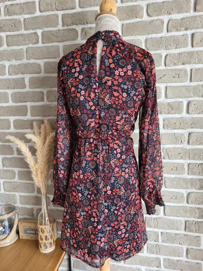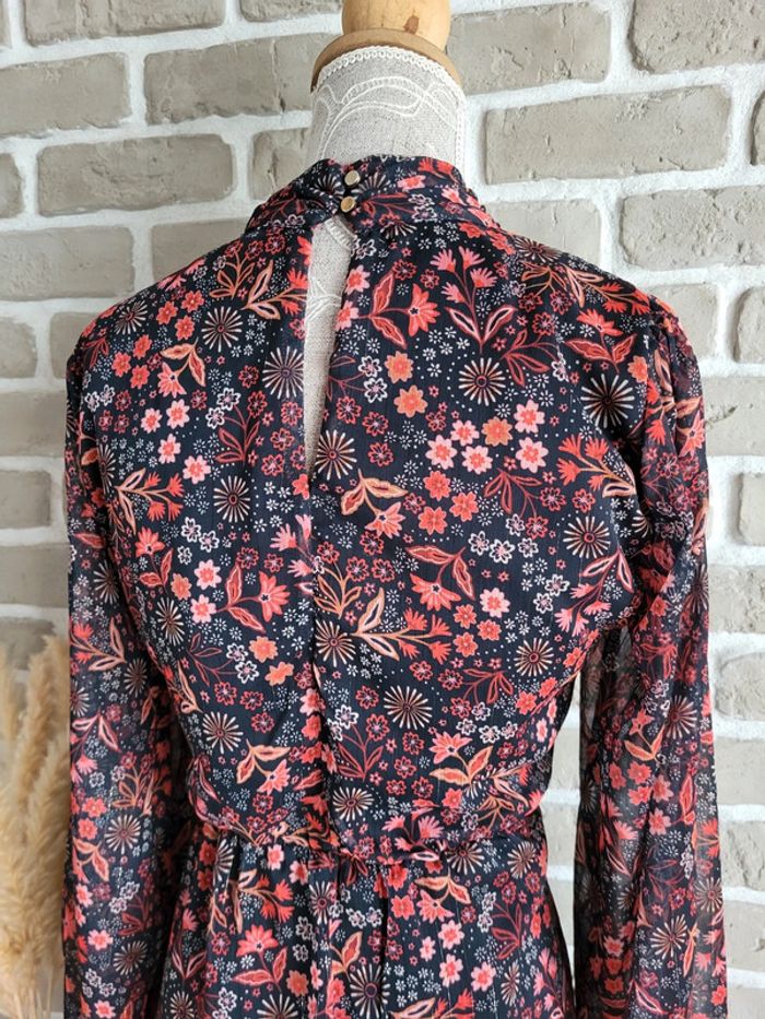 💝 Bénéficiez d'une réduction en créant lot dans mon dressing 🛍️ 🌸 Très belle robe Cache-Cache neuve, jamais portée 🎀 Voile léger et fluide imprimé fleuri dans des tons chaleureux : corail, rose, camel sur fond noir Doublé sauf aux manches pour les laisser vaporeuses Des fils métallisés parcourent la robe verticalement pour apporter une jolie brillance 🪷Coupe flatteuse avec taille haute marquée (élastique) Petit col montant froncé Manches longues bouffantes, smockées aux poignets Fermeture en goutte d'eau à l'arrière par 2 petits boutons dorés 🍥 Taille S 36 Longueur : 86 cm 🩷 La robe idéale pour un look bohème et romantique