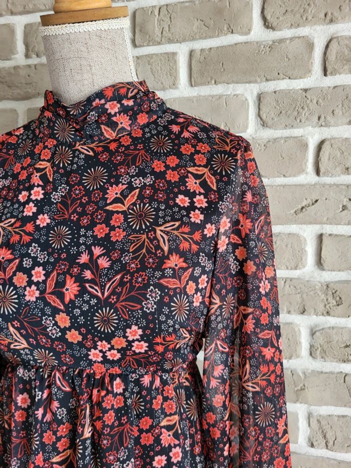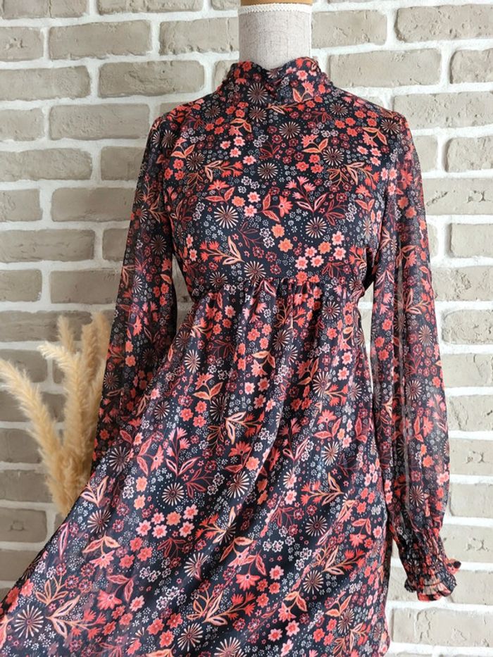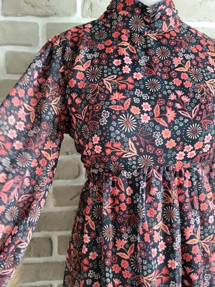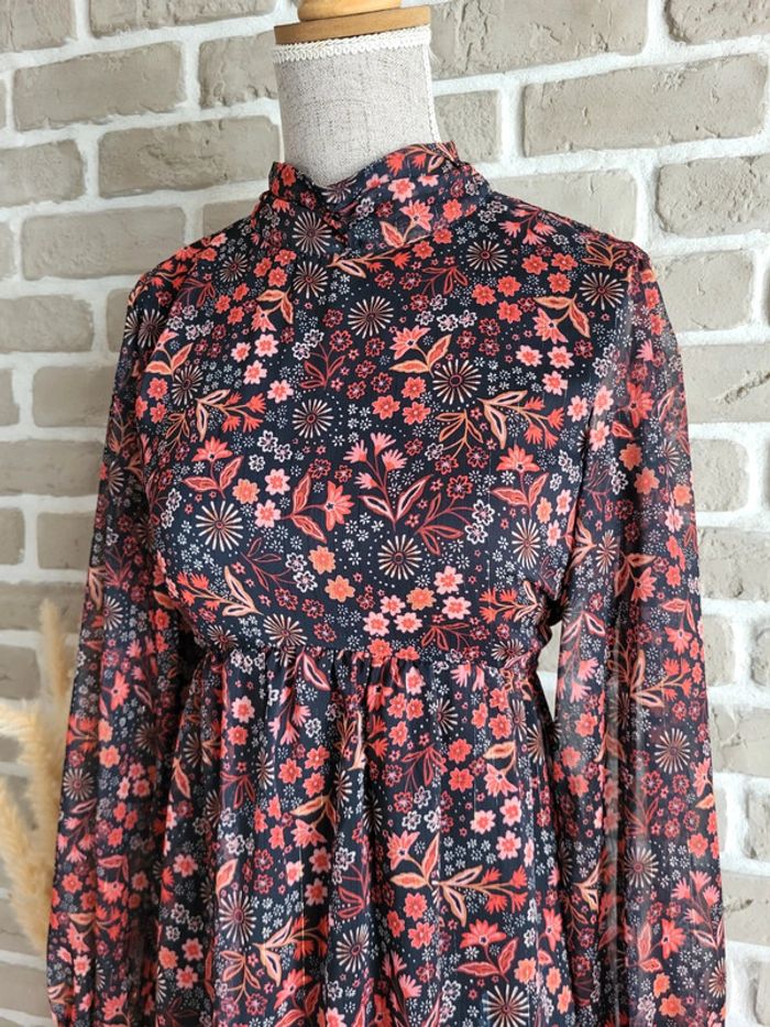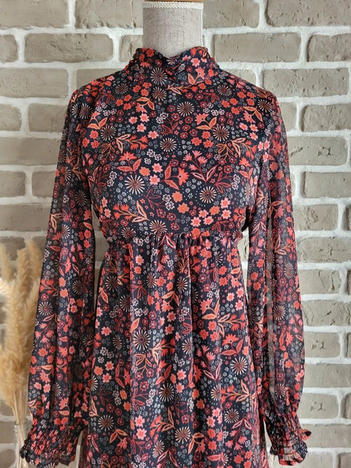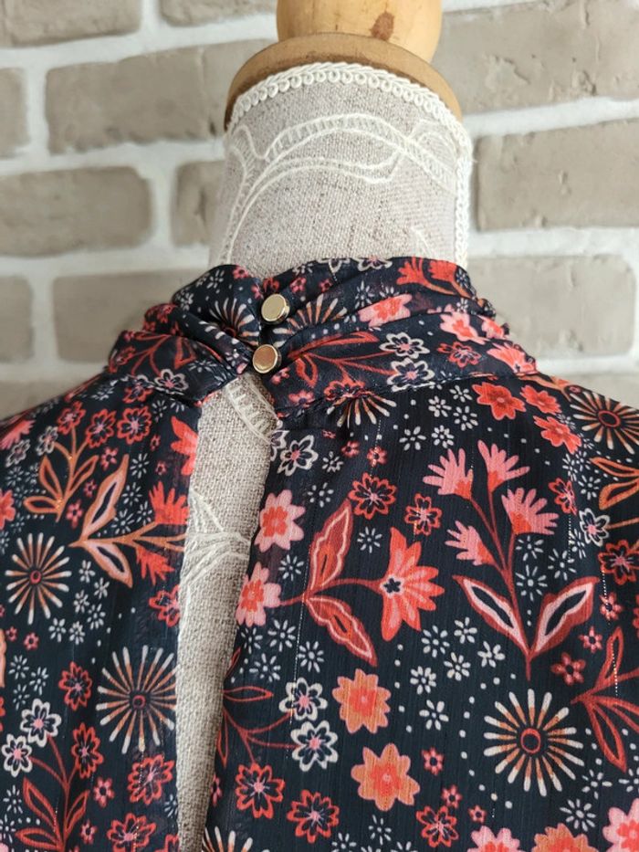 💝 Bénéficiez d'une réduction en créant lot dans mon dressing 🛍️ 🌸 Très belle robe Cache-Cache neuve, jamais portée 🎀 Voile léger et fluide imprimé fleuri dans des tons chaleureux : corail, rose, camel sur fond noir Doublé sauf aux manches pour les laisser vaporeuses Des fils métallisés parcourent la robe verticalement pour apporter une jolie brillance 🪷Coupe flatteuse avec taille haute marquée (élastique) Petit col montant froncé Manches longues bouffantes, smockées aux poignets Fermeture en goutte d'eau à l'arrière par 2 petits boutons dorés 🍥 Taille S 36 Longueur : 86 cm 🩷 La robe idéale pour un look bohème et romantique