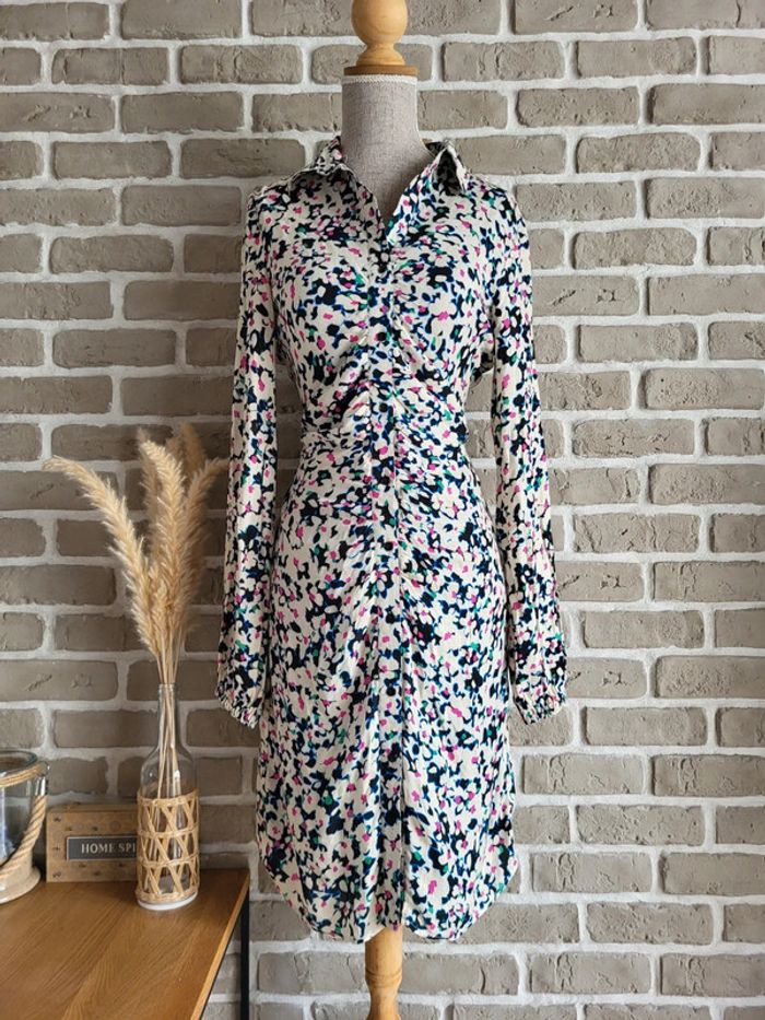 💝 Bénéficiez d'une réduction en créant lot dans mon dressing 🛍️ 🌸 Jolie robe chemise Promod neuve avec étiquette 🎀 Tissu légèrement crêpé et fluide, très agréable à porter, imprimé fleuri effet tacheté Doublé sauf aux manches 🪷Coupe flatteuse près du corps Col chemise, ouverture boutonnée froncée Taille marquée, smockée au dos Manches longues avec poignets élastiqués 🍥 Taille S 36, qui peut également convenir à du XS 34 Longueur : 91 cm 🩷 Chic et pleine de peps, cette robe apporte de l’éclat tout en restant sophistiqué. Elle se porte aussi bien pour une journée de travail que pour une sortie entre amis
