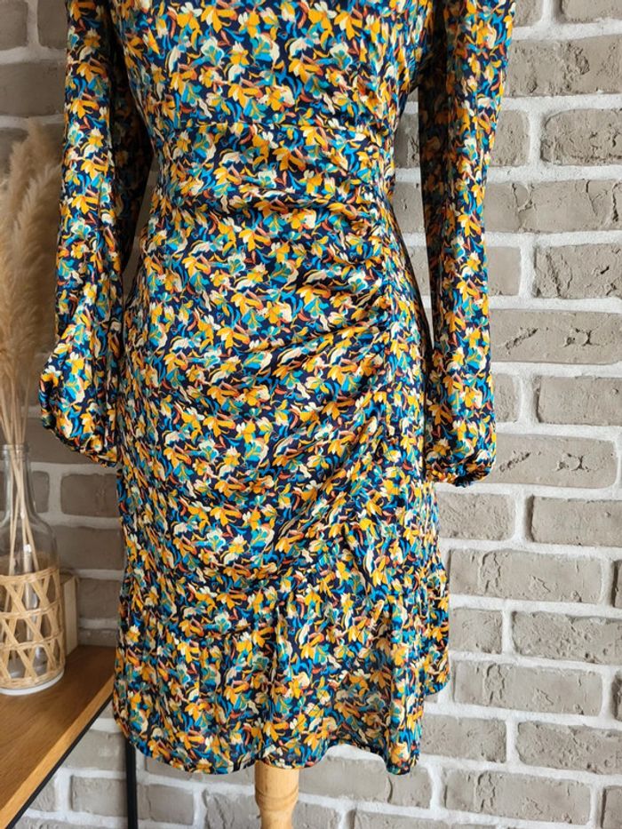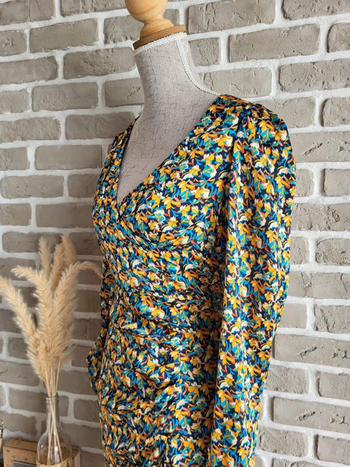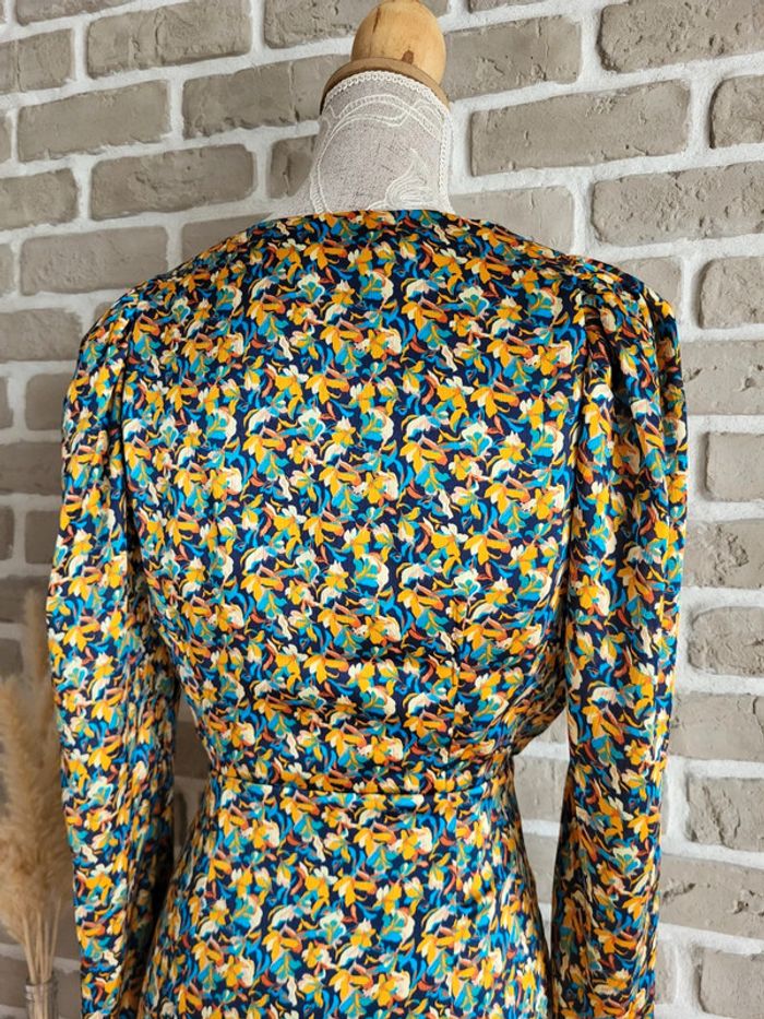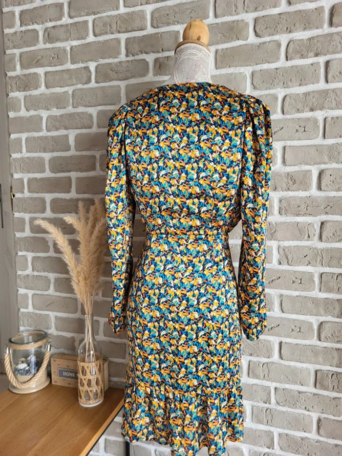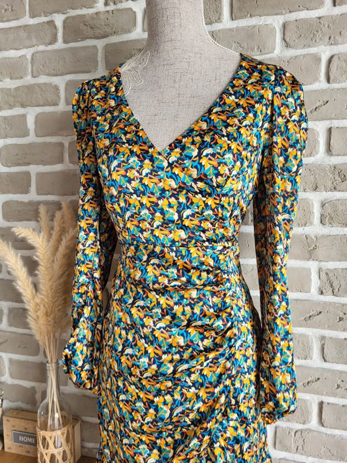 💝 Bénéficiez d'une réduction en créant lot dans mon dressing 🛍️ 🌸 Magnifique robe Promod comme neuve, portée 2 fois 🎀 Tissu fluide, léger et légèrement satinée imprimé fleuri dans les tons bleu et jaune oranger Entièrement doublé 🪷Coupe flatteuse avec taille marquée Décolleté croisé façon cache-cœur, fronces dans la partie jupe avec base volantée Manches longues bouffantes aux épaules et élastiquées aux poignets Ouverture par un zip invisible sur le côté 🍥 Taille S 36, qui peut également convenir à du XS 34 Longueur : 85 cm 🩷 Cette robe a un petit air rétro très chic qui pourra convenir à une occasion particulière ou au quotidien Son motif floral donne un air romantique tout en restant dynamique