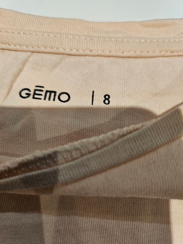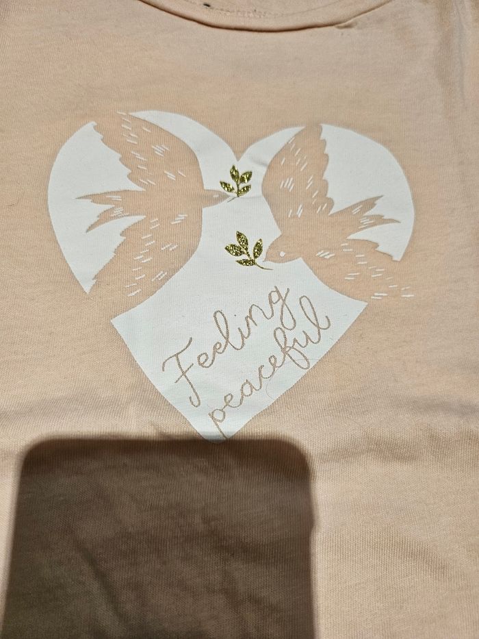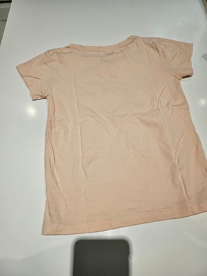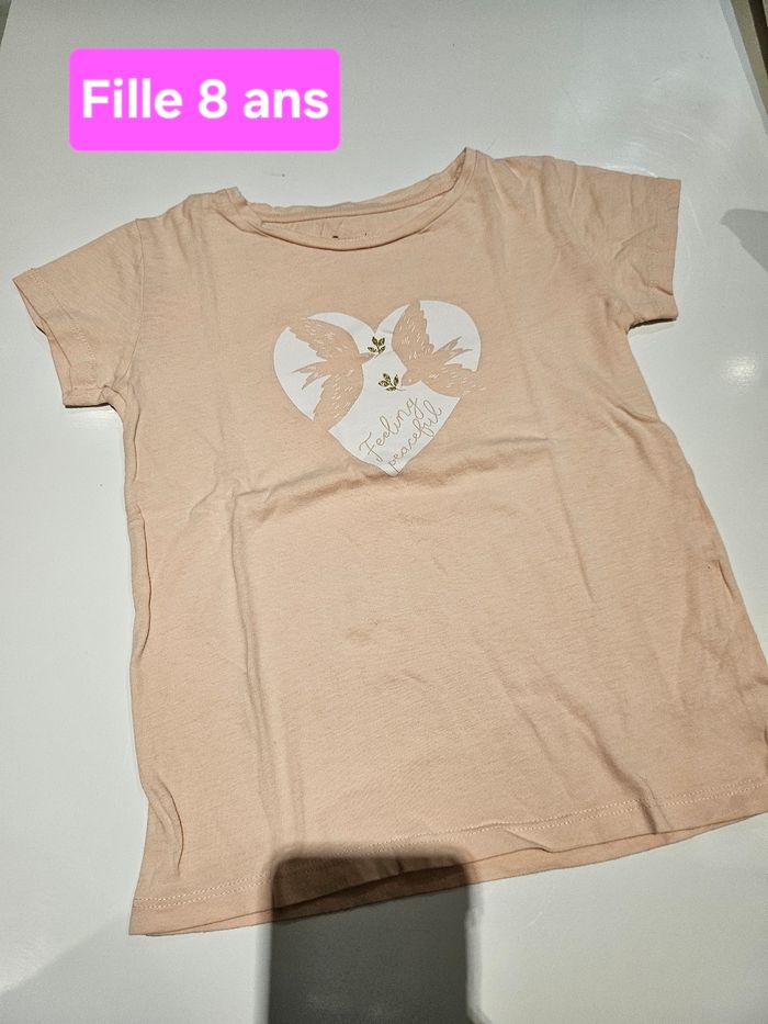 T-shirt manches courtes rose pâle avec imprimés devant blanc et doré. Marque : Gémo Taille : 8 ans