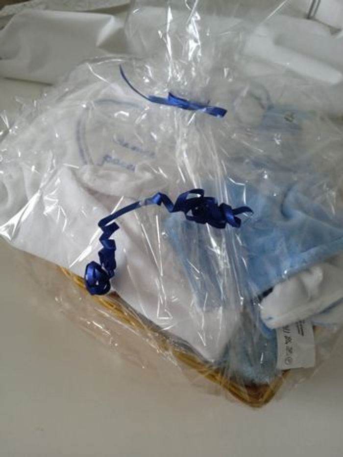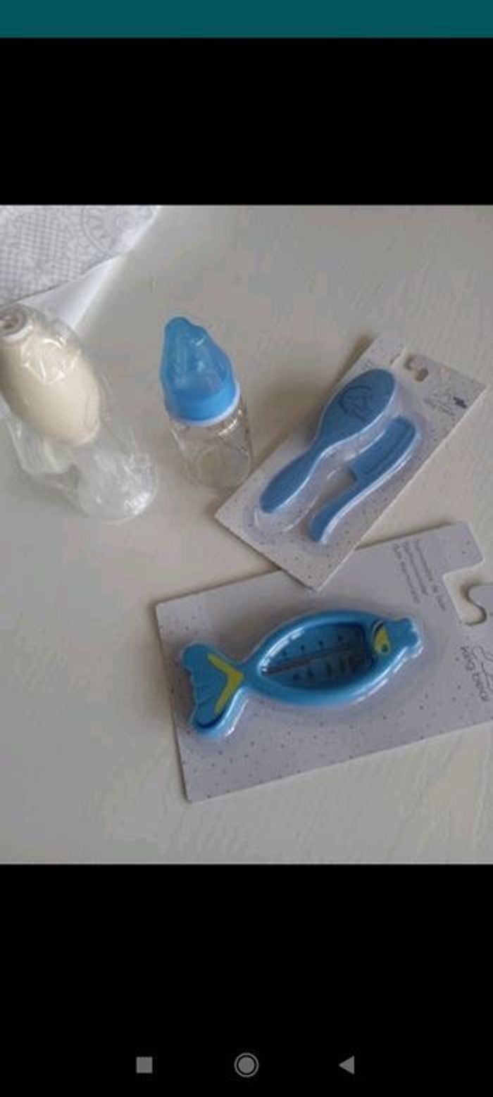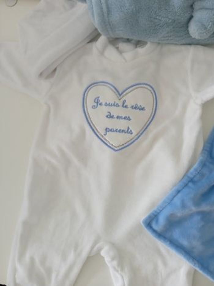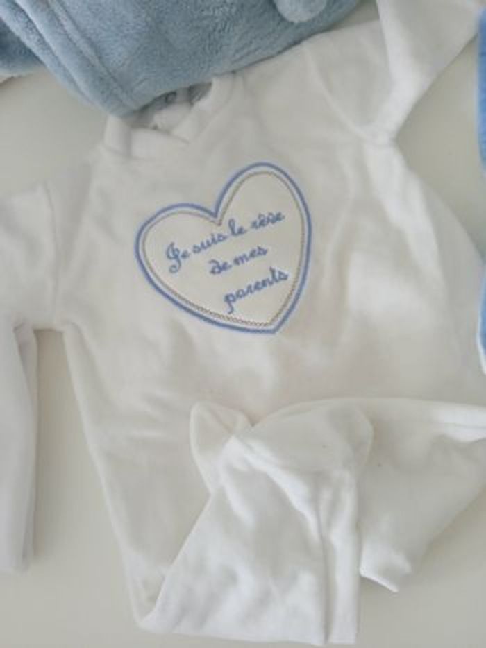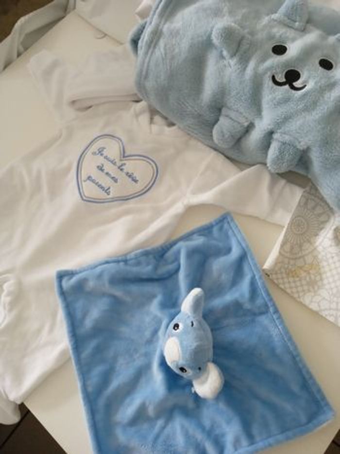 1 pijama et bonnet 1/3 mois 1 doudou 1 couverture super mimi chaton 70x100 1 thermomètre 1 biberons en verre 200 ml 1 brosse a cheveux 1 tire lait manuel Le tout bien joliment emballée ☺️