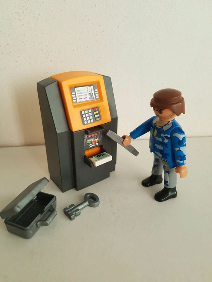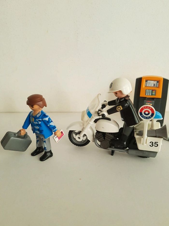 Accessoires : véhicule 2 roues, pistolet, casque, haut-parleur, panneau stop police, outil, DAB, billets, valise, clef et carte