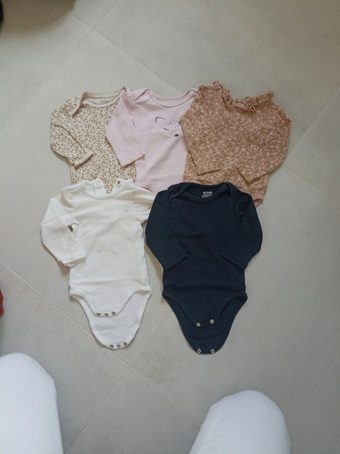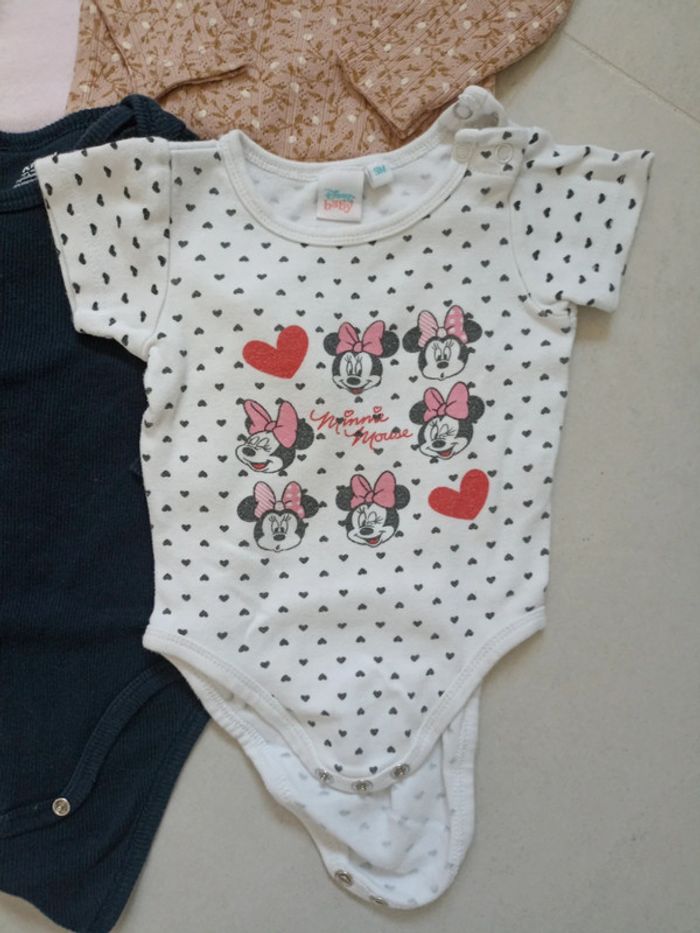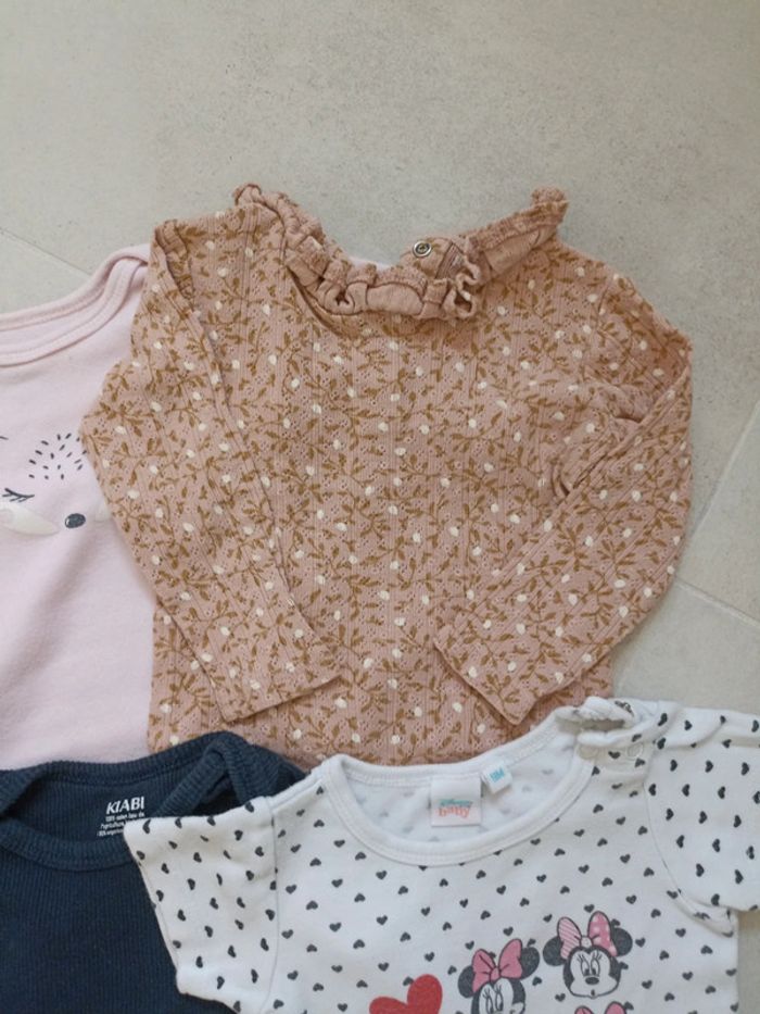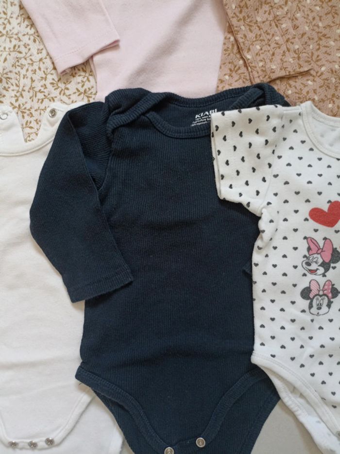 Bodies manches longues : - un Kiabi blanc côtelé avec fleurs vert et rose - un Mes petits cailloux rose avec tête de renard - un Kiabi rose côtelé avec col dentelé avec fleurs vertes et blanches - un blanc orchestra - un Kiabi bleu marine côtelé Manche courtes - Disney Baby Minnie Tous en très bon état !