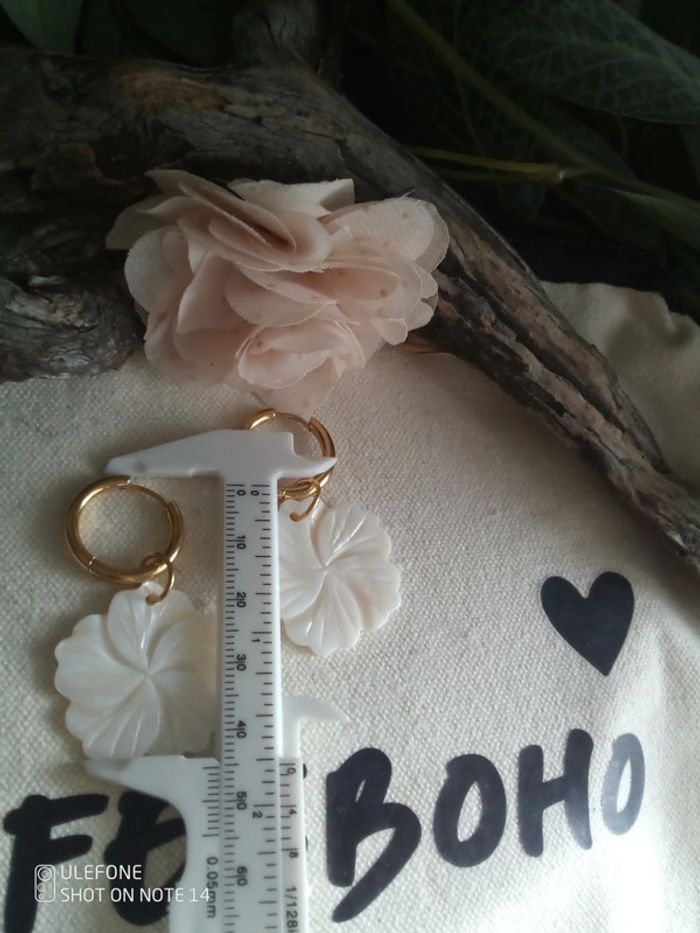 Boucles d'oreilles bohèmes fleurs de nacre blanche taillées à la main - photo numéro 3