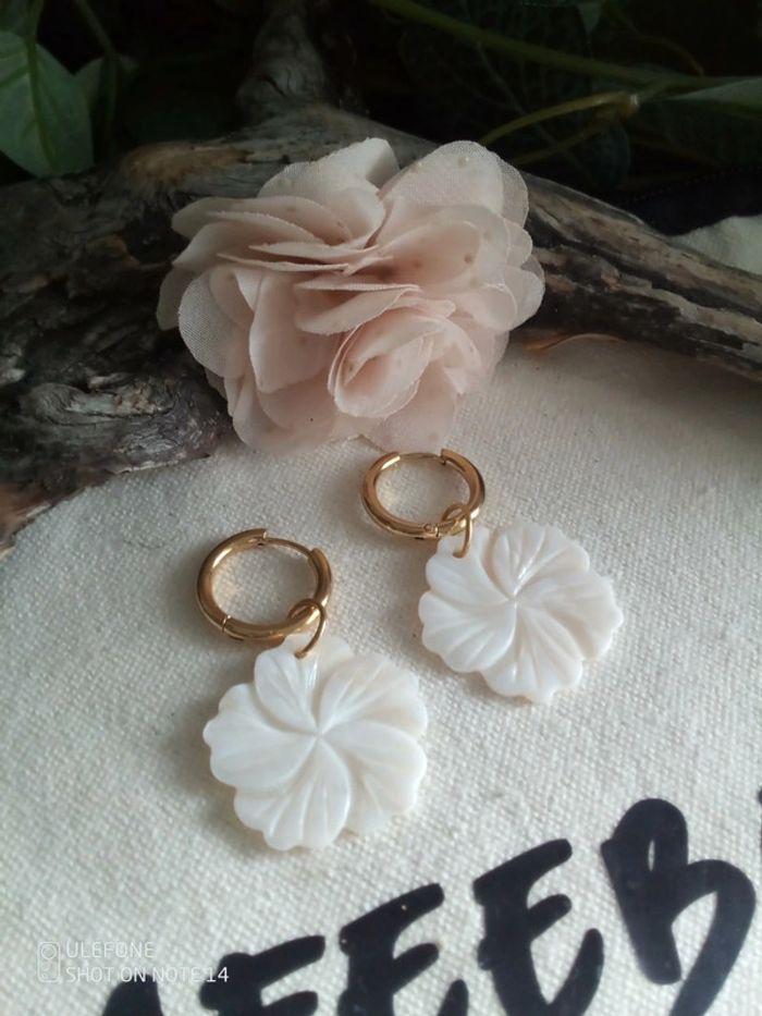 Boucles d'oreilles bohèmes fleurs de nacre blanche taillées à la main - photo numéro 1