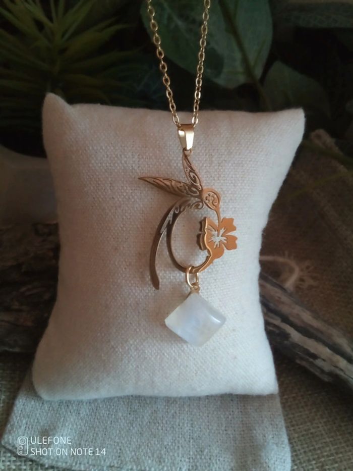 Collier colibri et pierre de lune à reflets bleutés - photo numéro 1